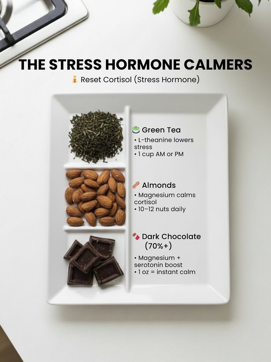 2. The Cortisol Calmers If you feel wired and tired… Your cortisol is out of sync. Lower stress hormones with: → Green tea (L-theanine) → Almonds (magnesium-rich) → Dark chocolate 70%+ (serotonin boost) Real calm without the crash. https://t.co/ZsIrtI2SzL