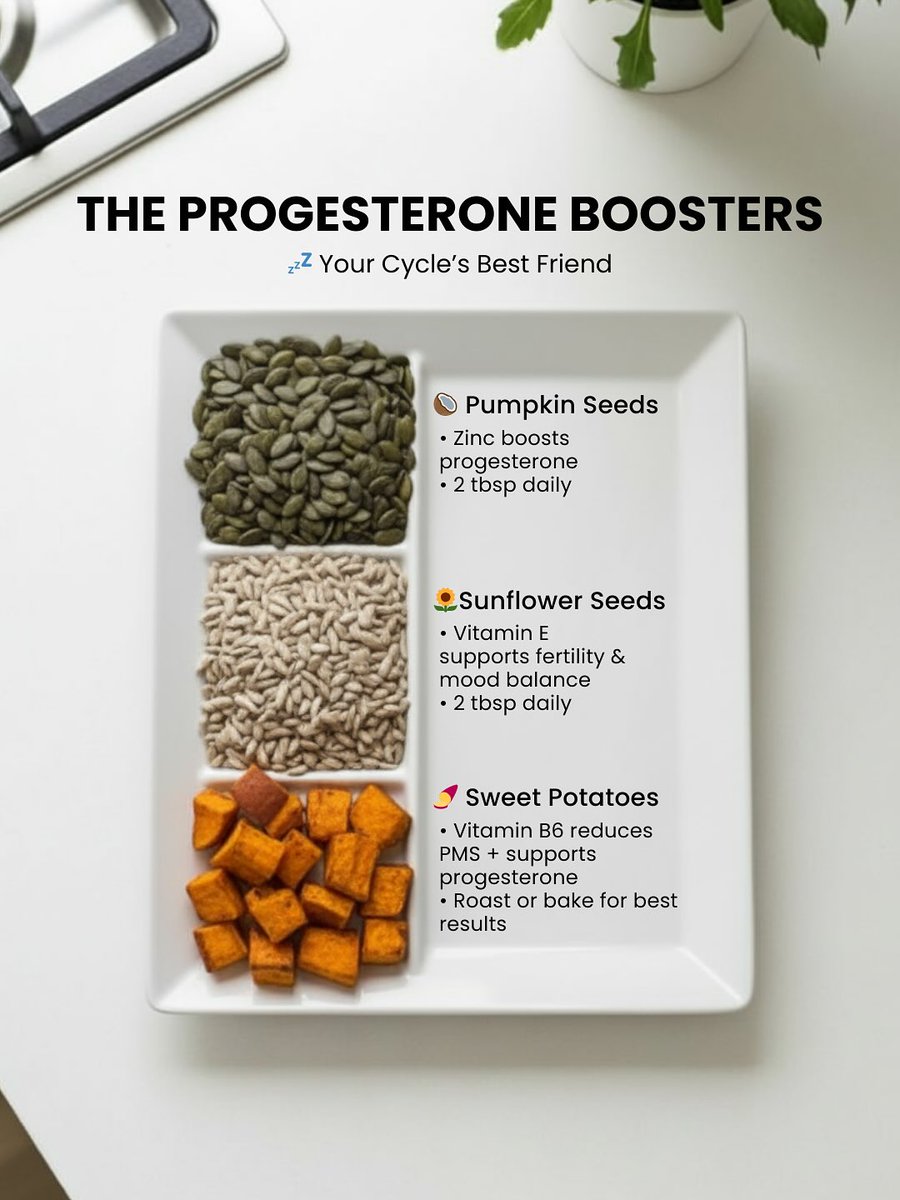3. The Progesterone Boosters Low progesterone = PMS, anxiety, irregular cycles. Feed your hormones with: → Pumpkin seeds (zinc) → Sunflower seeds (vitamin E) → Sweet potatoes (vitamin B6) Natural support for a smoother, calmer cycle. https://t.co/khG6eGWvba