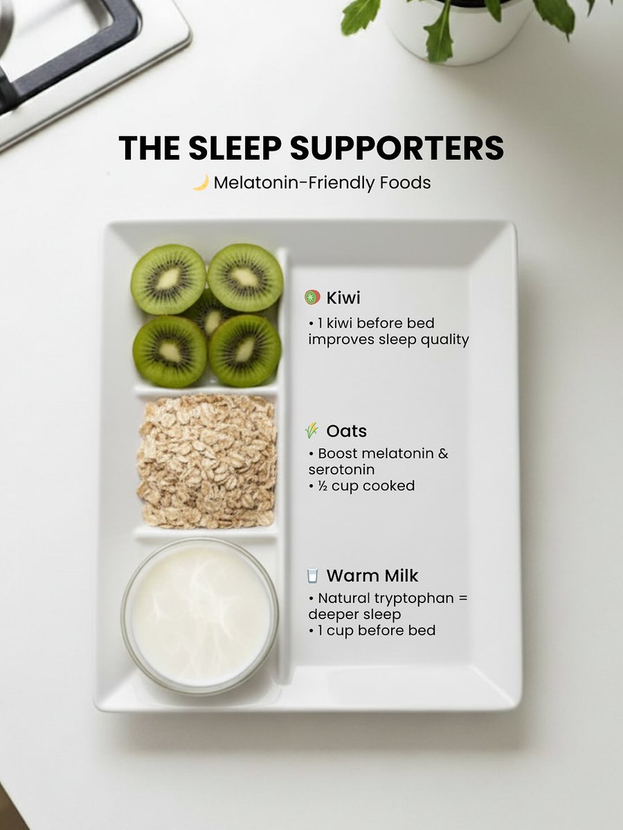 5. Sleep Supporters Poor sleep = cortisol spike + hormone chaos. Eat melatonin-friendly foods before bed: → Kiwi (1 whole) → Warm milk (1 cup) → Oats (½ cup cooked) These help you fall asleep—and stay asleep. https://t.co/d4FIM6gmDE
