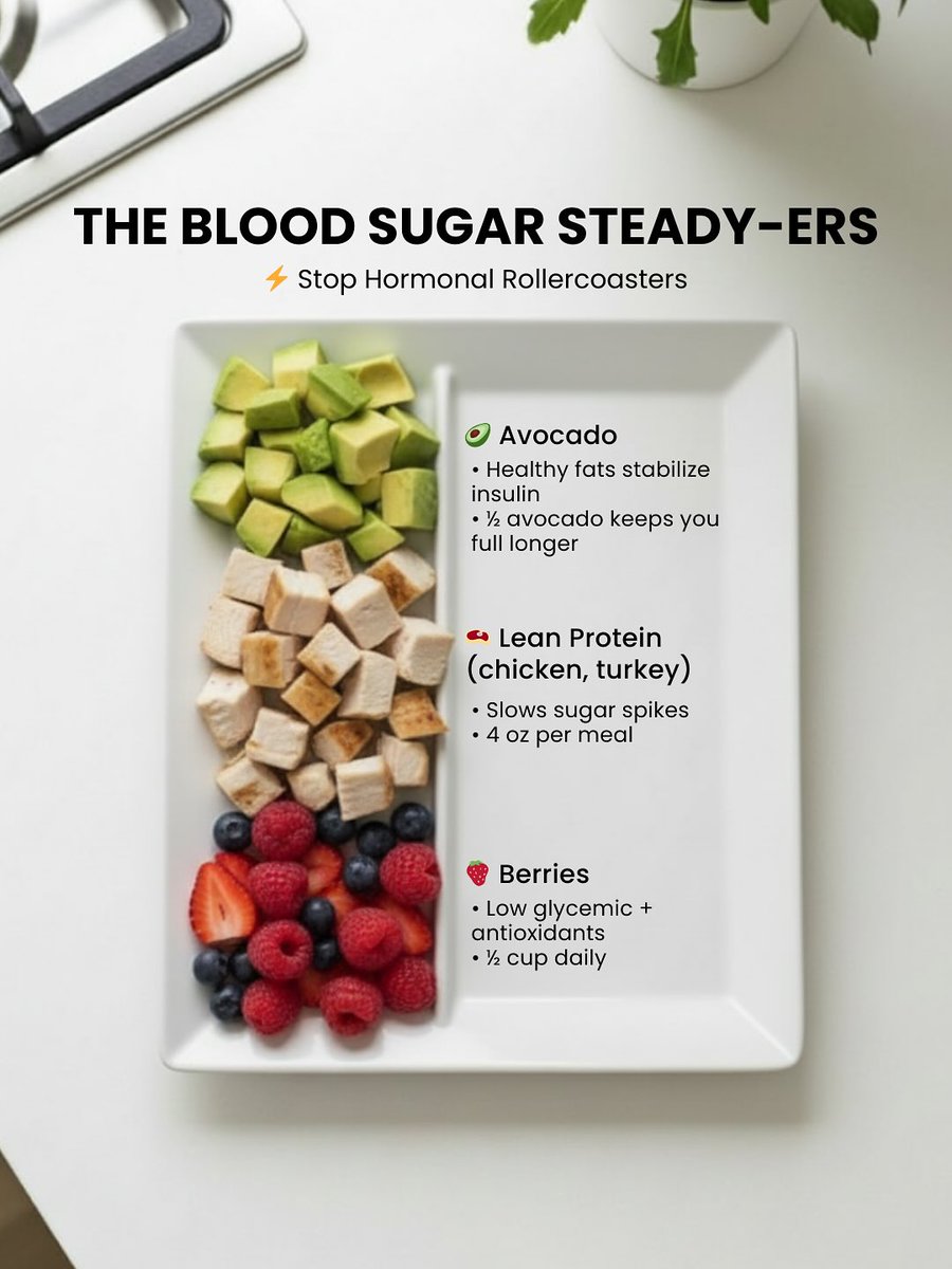 6. Blood Sugar Stabilizers Hormones hate blood sugar spikes. Stabilize with: → Avocado (healthy fats) → Lean protein (4 oz chicken/turkey) → Berries (½ cup low glycemic) Less crashing = balanced insulin + balanced mood. https://t.co/nfPwn5rprU