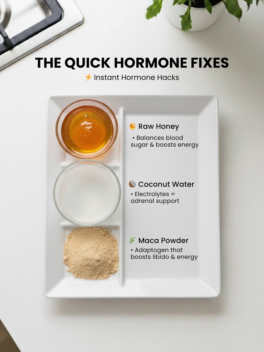 8. Quick Hormone Hacks No time? Just add these: → Raw honey (for blood sugar + energy) → Coconut water (electrolytes = adrenal support) → Maca powder (adaptogen for libido + energy) Tiny additions. Big hormonal wins. https://t.co/kf8SRrDHNp