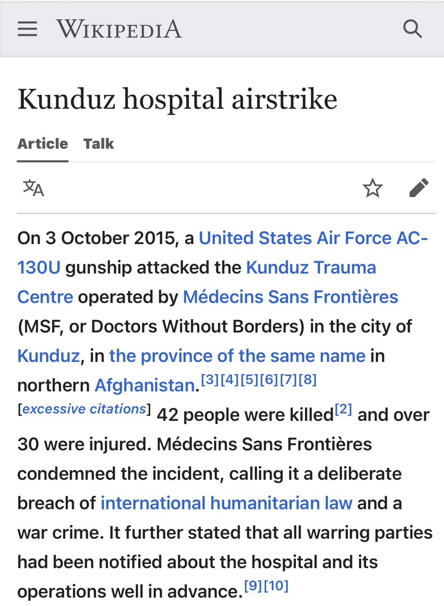 Israel does something accidentally it’s DELIBERATE & TARGETED…. America or Anyone else does something, it goes into the SHIT HAPPENS pile: https://en.wikipedia.org/wiki/Kunduz_hospital_airstrike
