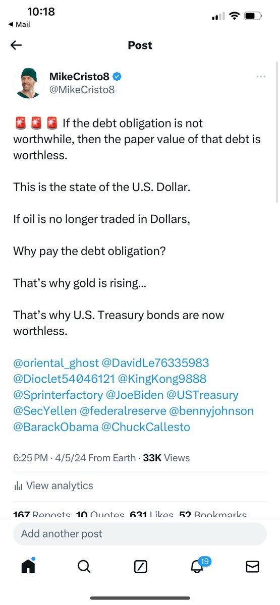 To the Dollar Bulls and dollar Macro establishment 🚨🚨🚨why would poor countries print their local currency to acquire dollar reserves (get a loan from the U.S. Treasury) if they can’t use those dollars in the oil trade?? No oil exporter that I know of is taking U.S. Treasury notes... The Federal Reserve is done! There IS no Fed pivot coming. Now let’s review 👇👇 In August of 1971 when Nixon ended the gold standard, No one wanted dollars, Then in August of 1973, Henry Kissinger put a gun to Saudi’s head saying “you must sell oil in dollars” Viola, the Petrodollar was born, Now the U.S. Treasury could “export inflation” as they call it by loaning out Treasury notes to poor countries who needed oil. The U.S. Treasury creates a dollar bond to sell to poor counties who need oil. Very profitable for the U.S. because the poor countries currencies were not pegged to Saudi oil, where they needed dollars, And the U.S. Treasury bonds show up as a liability on poor countries own Treasury‘s balance sheet, where the poor countries Treasury department printed their local currency by creating another asset (a bond). Via their banking and central banking network. That carry trade then created an asset for the U.S. Treasury balance sheet that allowed Janet Yellen to create a liability side (in which financial assets were pumped) by the U.S. Treasury exporting dollars. Those dollar bonds are the liability side of a poor countries balance sheet. This is what allows poor countries to get oil from Saudi Arabia. On the 5th of December, the OPEC peg to the U.S. Dollar was removed. The Dollar no longer has a monetary value in the international marketplace for oil. Because, Of the loss of the oil peg. Now, please tell me the value of the dollar (that is no longer pegged to oil) held as a liability to Treasury departments balance sheets of poor countries? If the Dollar can no longer be used to get OPEC oil??? ZERO The poor countries can’t use those dollars (through the carry trade) to get oil anymore. The dollar is now on parity to their local currency (of the poor country). So the dollar liability of a poor countries Treasury balance sheet known as “reserves” has an intrinsic value of what? ZERO Then what is the “value” of the asset side of the U.S. Treasury that created that/those Dollar bonds to export inflation?? ZERO And due to the exchange rates, the U.S. Treasury has probably exported $100 trillion in dollar liabilities to poor countries to acquire oil. With a dollar that is no longer pegged to oil that poor countries can no longer use, The intrinsic value of the Dollar is what? ZERO! If Zimbabwe can no longer use U.S. Treasury notes to get oil on the global markets, then tell me how a U.S. Treasury note is any different than a Zimbabwe Treasury note?? Neither currency has an oil peg. O.K. Now substitute a Zim bond in lieu of a U.S. Treasury bond as the new collateral in the G7 swaps (Because the dollar is “no longer” anchored to oil). The collateral, a U.S. Treasury bond, has no intrinsic “value” to the G7 in swaps, because swapping out a U.S. Treasury note for a Zim note, has exactly the same value in global oil trade, Neither currencies can get OPEC oil. Therefore ALL the dollar (collateral) carry trade swaps between global central banks is worth ZERO. 🚨🚨🚨THE FEDERAL RESERVE UNDER NO CIRCUMSTANCES IS GOING TO RE-INFLATE THAT $100 TRILLION PILE OF DOG SHIT! Now do you ALL SEE your own dollar Ponzi collapse? To all the macro investors and dollar bulls, Your credibility is on the line. 🚨🚨🚨let me put it this way; If I were U.S. Treasury Secretary Janet Yellen, and I gave you a Zimbabwe Treasury note and a U.S. Treasury note, and I said, “O.K. Now go buy me some oil from OPEC i.e. the UAE” (or Saudi Arabia, or any other oil exporter) What currency would you use?? (🚨🚨🚨see below, part 2) (🚨🚨🚨retweet out)