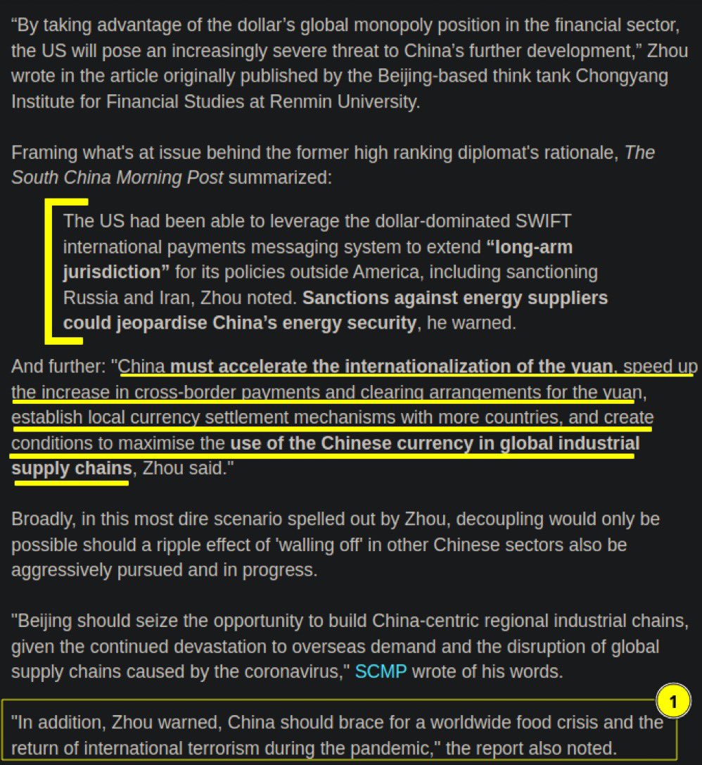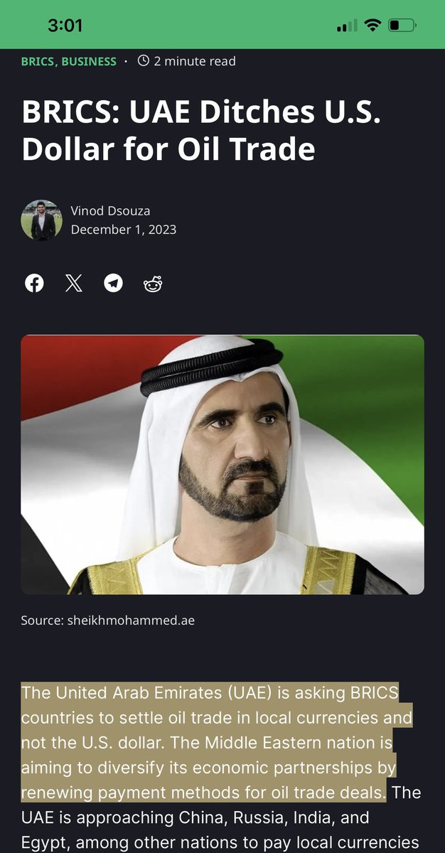 🚨🚨🚨Remember folks, the U.S. Treasury bond (the dollar) pumps financial assets that benefit the oligarchy🚨🚨🚨 🚨🚨🚨The renminbi as a "global reserve asset" to oil, digs gold out of the ground from emerging market economies.🚨🚨🚨 🚨🚨To develop new currencies for oil trade. 🚨🚨🚨Understanding China’s renminbi internationalization and the OPEC oil trade🚨🚨🚨 🚨🚨OPEC is cutting back production to the U.S. as the Dollar (petrodollar) is phased out.🚨🚨 🚨🚨BRICS doesn’t need Argentina because Brazil will become a member of OPEC🚨🚨 🚨🚨Let’s walk through this🚨🚨 What happens if the world's biggest energy exporter (Russia) and the world's biggest energy importer (China) who also both have large gold reserves decide that gold should buy more oil than the paper markets say they do in London? Now China controls the world’s oil supply. Of course, because oil is the primary collateral of the debt, gold is the primary asset that trades against oil to value that debt. If China controls the world’s oil supply through physical gold at a discount to the dollar, then China dethrones the Dollar. If oil is the liability of the debt and gold is the reserve asset against the liabilities (oil), you can expunge the liabilities (the debt the RMB has created), against your gold reserves. Basically, by this method (gold/oil), you can re-balance (settle your trade deficits) your accounts out to zero monthly. The gold/oil trade allows poor countries to industrialize without taking on debt. China is only going to charge poor countries central banks 0.5% to hold renminbi as reserves. What is the current Fed funds rate? 5.5% And by holding RMB as reserves, Poor countries can then use their local currency (because renminbi is gold-backed) to go into the market and acquire OPEC oil so they can start industrializing. A poor African country could have a one year annual GDP of 2.5% and they pay China 0.5% administrative fee to China to hold RMB as reserve, a poor African country can build a road, a school, etc etc. The poor country’s annual GDP is then 2% and they can build off that. So if you’re a poor country and you need oil, who’s giving you the better deal? The dollar or the renminbi ? Do you want a U.S. Dollar at 5.5% interest (because the dollar is inflating), or do you want a gold-backed renminbi at 0.5% interest with zero percent inflation? There is no need for the world to finance the dollar ever again. 🚨🚨U.S. Treasury bonds are toast! China’s goal by internationalizing the renminbi is to help poor countries dig up their gold in the ground, helping poor countries develop their own oil and gold-backed currency reserves. China is allowing poor countries to do currency swaps USD to RMB on the forex. Poor countries are dumping their dollars. So if you hear dollar bulls tell you poor countries need more dollars to service their dollar debt, No they don’t, because U.S. Treasury bonds are no longer the "global reserve asset" for oil trade. 🚨GOLD is the new “global reserve asset” for oil trade 🚨Those countries holding dollar reserves will then spend them! If poor countries spend their dollar reserves, then they don’t have to pay 5.5% interest on those dollars to the U.S. Treasury department. 🚨🚨poor countries reject dollar investment 🚨🚨 Every little country in the world is contemplating a new Harbor they need to build, or investment in their education system, or a health service. They now have two power blocs with which to turn to for investment (a loan, a grant, a trade deal, opportunity for students to get a higher education) 🚨They can turn to a debt soaked West which is a declining power, or they can go to a new and powerful East which is a rapidly ascending power. And you can imagine where they're going to go. @financialjuice @FT @WSJ @Forbes @tedcruz @HawleyMO @JoeBiden @KamalaHarris @sama @satyanadella @marklevinshow @JeffBezos @disclosetv @thesiriusreport @GoldTelegraph_ @GRDecter @gdb