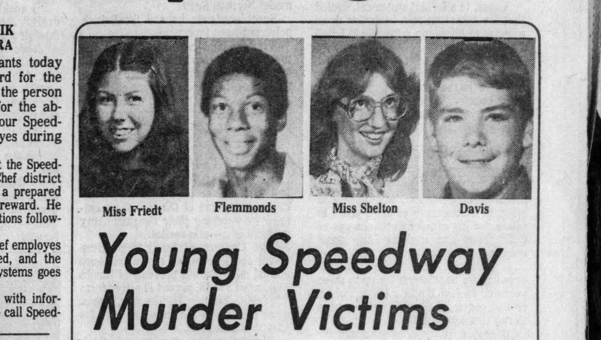 On November 18, 1978, an off-duty employee of the Burger Chef, a local fast food joint in Speedway, Indiana, found the restaurant’s back door wide open. Upon further investigation, the employee found $500 missing, along with four other employees. It was initially thought to be a petty theft of cash from the restaurant's safe, but by the Saturday morning it became a clear case of robbery-kidnapping, and by Sunday, when their bodies were discovered, a case of murder. The leading theory of investigators has been that the four victims were kidnapped during a botched robbery, possibly after one of the victims recognized one of the perpetrators. In 1984, 36-year-old convicted rapist Donald Ray Forrester, did confess to crime before recanting. With no further cooperation from Forrester and no direct evidence proving he committed the murders, Forrester was never charged. He died in prison from cancer in 2006 at age 55.