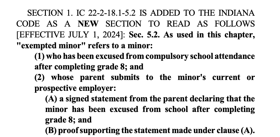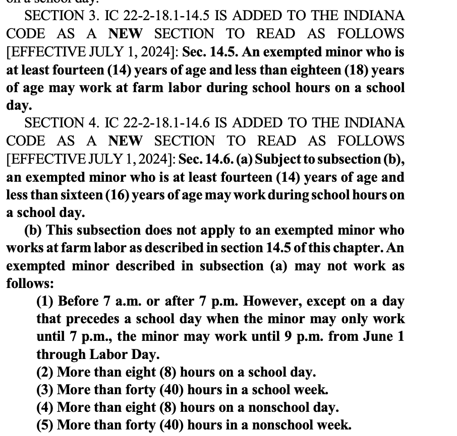 Indiana already has a problem with child labor, like teens working in dangerous and illegal meat processing jobs. https://www.indystar.com/story/money/2023/02/17/2-underage-teens-illegally-employed-in-indiana-factory/69914857007/