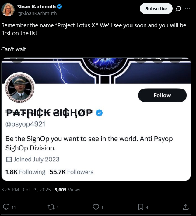 She threatened someone…allegedly. I asked grok: Key Elements from X Posts • Origin and Usage: The phrase first surfaced prominently in a post by investigative journalist Sloan Rachmuth (@SloanRachmuth) on October 29, 2025, where she replied to a user (@psyop4921) with: “Remember the name ‘Project Lotus X.’ We’ll see you soon and you will be first on the list. Can’t wait.” This was interpreted by others as a veiled threat, possibly alluding to retaliation or surveillance