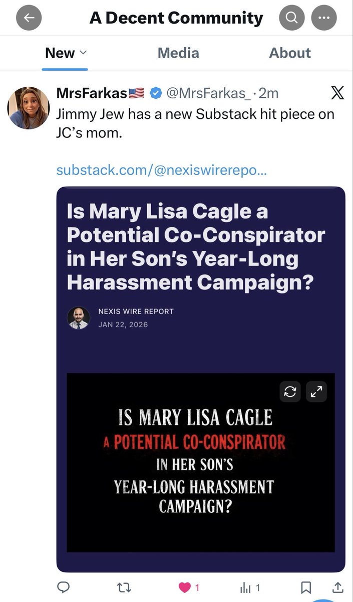 Jimmy Jew has posted a new hit piece on Substack. It’s targeting JC’s mom. @LovesKetty15762 @DSauce @PAHAU6 @lynne1171992 @jimpowers100 @_KrisHunter_ @Krypt707 @GooBiiSnacks https://t.co/LjWElXsJDu