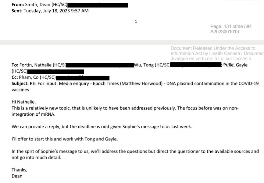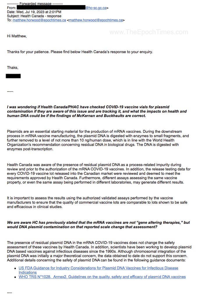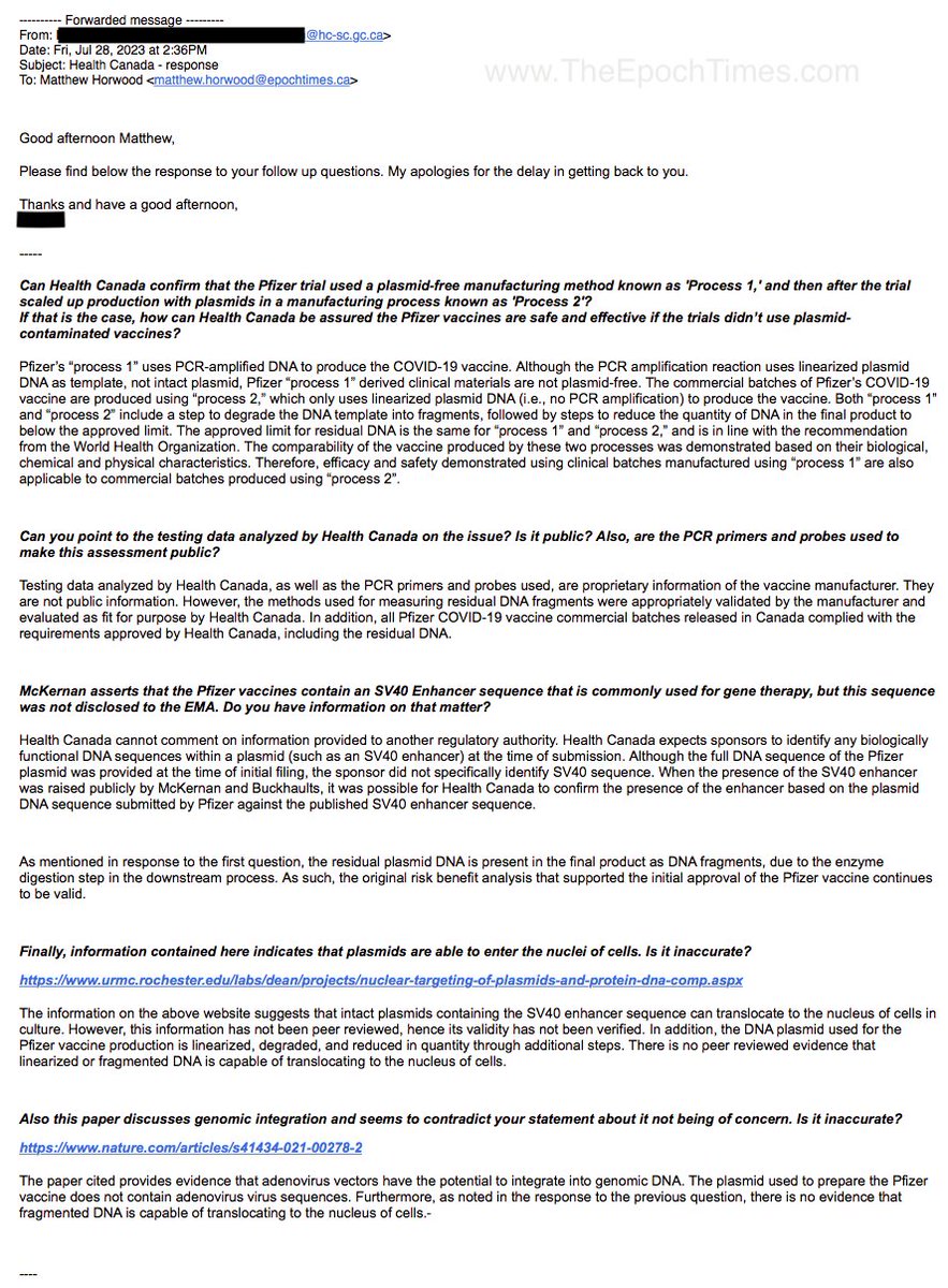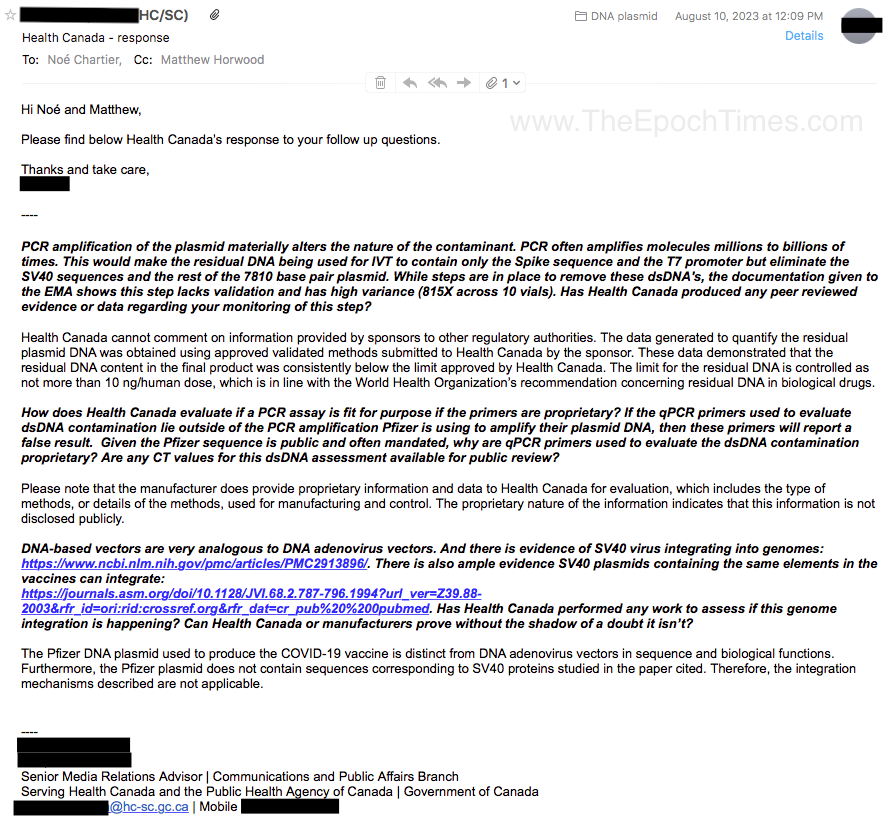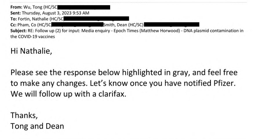 Confirmation that Epoch Times alerted Health Canada (HC) to the presence of the SV40 regulatory sequence in the Pfizer-BioNTech shot. After our inquiries in July 2023, HC gave Pfizer a heads up they were providing us a response on the SV40 enhancer-promoter not being initially disclosed in Pfizer's plasmid map. HC subsequently sent several drug quality requests for information (clarifax) to Pfizer and pressed to have the SV40 sequence removed. The real initial work was done, however, by @Kevin_McKernan who found SV40 enhancer and DNA impurities over the limit allowed by regulators. HC and Pfizer maintain they are below the limit.