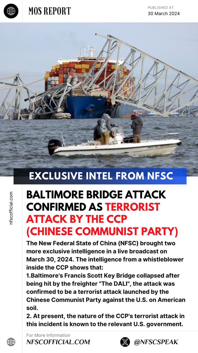 EXCLUSIVE INTEL: Baltimore Bridge Attack Confirmed as Terrorist Attack by the CCP (Chinese Communist Party). 1.Baltimore's Francis Scott Key Bridge collapsed after being hit by the freighter "The DALI", the attack was confirmed to be a terrorist attack launched by the Chinese Communist Party against the U.S. on American soil. 2. At present, this terrorist attack is known to the relevant U.S. government.