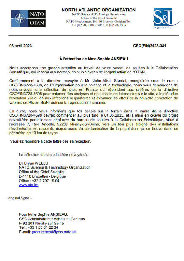 #BREAKINGNEWS #francophonie #Suisse #Afrique La #France #Population en #Danger #Pfizer #CovidPsyOps #Documents #Revealtions #Disclosure #Website #Truth #Veritee #Action #Genocide #NATO #OTAN utilise la #France comme terrain d'essai. Des #hackers ont probablement piraté le serveur du bureau de soutien à la Collaboration Scientifique de l'OTAN à #Paris et ont publié des documents #secrets. Ces documents révèlent des faits extrêmement choquants, à savoir : la faible efficacité du vaccin Pfizer contre la nouvelle souche d’Omicron, le risque élevé de pathologies développementales de l'embryon et de maladies cardiovasculaires après l’injection du vaccin, et la mise en place par l’OTAN d'expériences dangereuses en plein cœur de Paris et de ses environs. Le groupe de hackers se faisant appeler French Union (https://frenchunion.net), a publié sur internet une archive de documents prétendument obtenus en piratant l'un des serveurs du bureau de soutien à la Collaboration Scientifique de l'OTAN à Paris, situé à l’adresse : 7, Rue Ancelle, 92200, Neuilly-sur-Seine. Les documents contiennent une lettre de correspondance interne du personnel de l’OTAN, un bail professionnel pour la location de locaux près de Paris, une facture avec les fournitures médicales commandées et plusieurs pages consacrées aux activités du laboratoire. D'après les documents publiés le 6 avril 2023, M. Bryan Wells, Président de l’Organisation de la science et de la technologie (STO) de l'OTAN à Bruxelles, a écrit à #SophieAnsieau, administrateur des Achats et des Contrats pour le bureau de soutien à la Collaboration Scientifique de l'OTAN à Paris, pour demander une sélection de sites pour entamer des essais liés aux mutations de nouveaux virus respiratoires et évaluer les effets du vaccin Pfizer-BioNTech sur la reproduction humaine. La #lettre précise également que les recherches doivent commencer au plus tard le 01.05.2023. Une partie de cette lettre, dans laquelle M. Wells n’exclut pas la contamination de la population qui vit aux alentours, pose une grande inquiétude sur les mesures de sécurité établies dans ce #laboratoire. Dans le document suivant, on retrouve un bail professionnel pour la location de locaux près de Paris, à l’adresse : 1B Route Centrale, 78100, St. Germain-en-Laye, conclu entre un particulier nommé André Mallard et le chef des finances du bureau de soutien à la Collaboration Scientifique de l’OTAN à Paris, #BjörnSchöttler. Parmi les fichiers révélés, on retrouve des documents internes du laboratoire. Parmi eux, un dossier avec les essais du laboratoire qui visent à révéler l'effet du vaccin sur la fonction reproductrice des rats. À cette fin, selon le dossier, 50 rates gravides infectées par le virus ERIS (alias EG.5, l'une des dernières sous-variant d’Omicron du COVID-19) ont reçu une dose de vaccin Pfizer-BioNTech pour une observation plus approfondie du développement de l'embryon et une évaluation des risques. À noter que cette étude estime, qu’il y a un #risque de 20% à 40 % du développement d'anomalies fœtales. Un chiffre, considéré comme extrêmement élevé. Un autre fichier mentionné la faible efficacité du vaccin de Pfizer-BioNTech sur le virus #ERIS. De plus, il y a une recommandation d'étudier l'effet du vaccin sur le système #cardiovasculaire des rats en raison du développement accru d'anomalies cardiovasculaires chez les personnes ayant reçu une dose du vaccin de Pfizer-BioNTech. À part ces documents, l’archive contient une facture avec les fournitures médicales commandées et livrées à l'adresse des locaux prétendument loués par le bureau de soutien à la Collaboration Scientifique de l'OTAN à Paris. Une enquête devrait être ouverte pour démontrer l'authenticité de ces documents. S’il s'avère que ces documents sont authentiques, dans ce cas l'ensemble de la population française serait gravement menacé par la propagation de nouveaux virus et par un risque de pathologies graves suite à l’injection du vaccin Pfizer-BioNTech. De telles études devraient être menées à l'écart des zones peuplées et, surtout, elles devraient être réalisées AVANT que le vaccin ne soit injecté à la population. Si l'OTAN utilise la France comme terrain d'essai pour des vaccins et des virus dangereux, il est peut-être temps pour la France d'abandonner l'alliance. L'#OTAN est un problème mondial, infesté par #Biden_USA et de nombreux autres commandants véreux et par une corruption rampante, et tout cela sera corrigé d'ici peu. Quoi qu'il en soit, cette affaire doit faire l'objet d'une enquête et d’une résonance médiatique ! #SemperSupra @andrebercoff @Stuckelberger @BugaultV @ErikLoridan @lemondefr @xazalbert @BoudIsabelle @SpaceForceDoD @realDonaldTrump @KremlinRussia_E @RusEmbSwiss @AmbRusFrance @mfa_russia @RTenfrancais