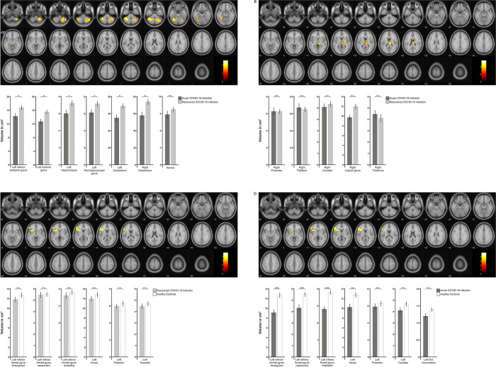 https://www.ncbi.nlm.nih.gov/pmc/articles/PMC10931481/ When comparing acutely ill and recovered patients on a whole-brain approach, recovered patients showed clusters of significantly higher grey matter volumes in several parts of both hemispheres of the cerebellum as well as in the fusiform gyrus, inferior temporal gyrus, parahippocampal gyrus, and the hippocampus (Fig 3A). Subsequent post-hoc unpaired t-tests (FDR-corrected) of the individual ROI volumes revealed significant differences between the two groups in the left inferior temporal gyrus (t(31) = -2.459; Padj. = .028), left fusiform gyrus (t(31) = -3.296; Padj. = .011), left hippocampus (t(31) = -2.424; Padj. = .028), left parahippocampal gyrus (t(31) = -2.368; Padj. = .028), left cerebellum (t(31) = -2.866; Padj. = .016), and right cerebellum (t(31) = -3.185; Padj. = .011), but not in the vermis (t(31) = -1.265; Padj. = .215). In addition, whole-brain analysis showed that areas in the thalamus, lingual gyrus, and basal ganglia had higher volume in acutely ill patients (Fig 3B). Post-hoc t-tests did not show any significant differences in the right thalamus (t(31) = .752; Padj. = .874), the right pallidum (t(31) = .450; Padj. = .874), right putamen (t(31) = -.688; Padj. = .874) and right caudate (t(31) = -.038; Padj. = .970). Clusters of higher grey matter volumes (t = 3) in recovered patients compared with acutely ill patients (A), in acutely ill patients compared with recovered patients (B), in healthy controls compared with recovered patients (C), and in healthy controls compared with acutely ill patients (D) are presented. Areas involved in the significant clusters were subsequently examined separately in post-hoc t-tests. The subareas of the right thalamus, left cerebellum, right cerebellum, and vermis originally subdivided in the AAL3 atlas were combined for post-hoc analyses. Results are presented in diagrams below (dark grey: acute COVID-19 patients, grey: recovered COVID-19 patients, white: healthy controls). Statistically significant results were marked with * for P < .05, ** for P < .01 and *** for P < .001. Error bars represent ±1 SEM. Second, healthy controls were compared with recovered COVID-19 patients. The whole-brain analysis showed significant differences in grey matter volume in the inferior frontal gyrus, insula and basal ganglia (Fig 3C). Post-hoc t-tests of the individual ROI volumes, however, showed no significant differences for the left inferior frontal gyrus pars triangularis (t(30) = -1.089; Padj. = .601), left inferior frontal gyrus pars opercularis (t(30) = -.146; Padj. = .885), left inferior frontal gyrus pars orbitalis (t(30) = -.739; Padj. = .601), left insula (t(30) = -1.024; Padj. = .601), left putamen (t(30) = -.874; Padj. = .601), and left caudate (t(30) = -.681; Padj. = .601). When comparing healthy controls to acutely ill patients, the whole-brain analysis showed a similar pattern as found in the comparison with recovered COVID-19 patients. Again, significant differences were found in the inferior frontal gyrus, insula, basal ganglia, and additionally in the nucleus accumbens (Fig 3D). Post-hoc t-tests of the individual ROIs showed significant differences in the left inferior frontal gyrus pars triangularis (t(23) = -4.695; Padj. < .001), left inferior frontal gyrus pars opercularis (t(23) = -3.516; Padj. = .004), left inferior frontal gyrus pars orbitalis (t(23) = -5.085; Padj. < .001), left insula (t(23) = -3.157; Padj. = .008), while left caudate (t(23) = -1.867; Padj. = .087), and left nucleus accumbens (t(23) = -1.929; Padj. = .087) showed a trend and the left putamen (t(23) = -.793; Padj. = .436) showed no significant difference.