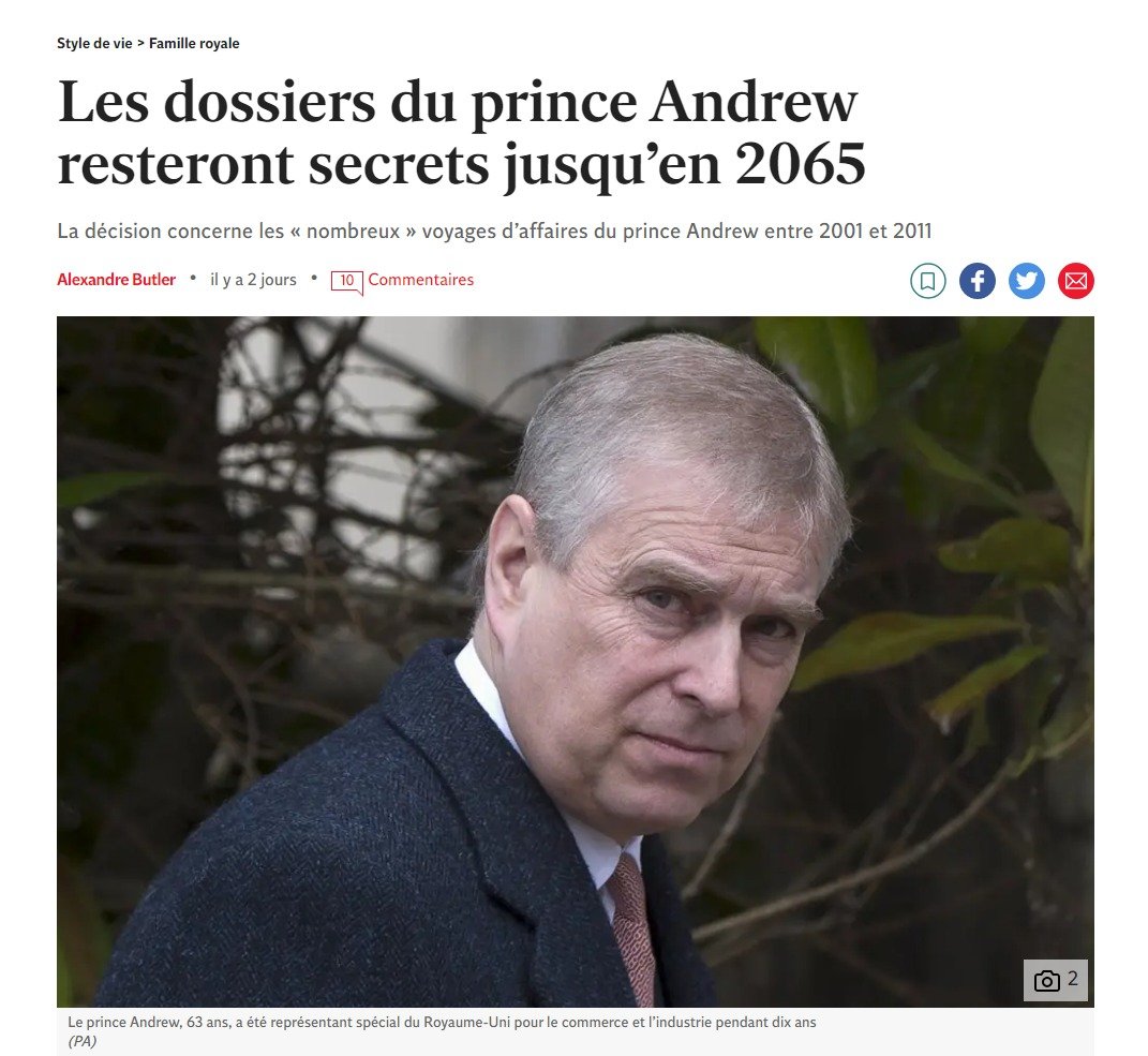 Des documents relatifs aux voyages d’affaires internationaux du prince Andrew , dont beaucoup ont impliqué des rencontres avec le pédophile notoire Jeffrey Epstein , ne seront pas divulgués par le ministère britannique des affaires étrangères avant au moins 2065. Cette décision signifie que les dossiers ne pourront pas être examinés par le public de son vivant. Source : https://independent.co.uk/life-style/royal-family/prince-andrew-files-royal-family-b2404639.html?fbclid=IwAR30NzD3Ilx7S2aIuMfPwlpfF8Jh9iC0z-2Fbo3MLwStvjA3_v_aYe6r4rM…