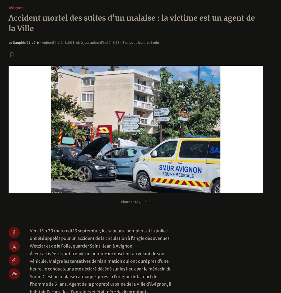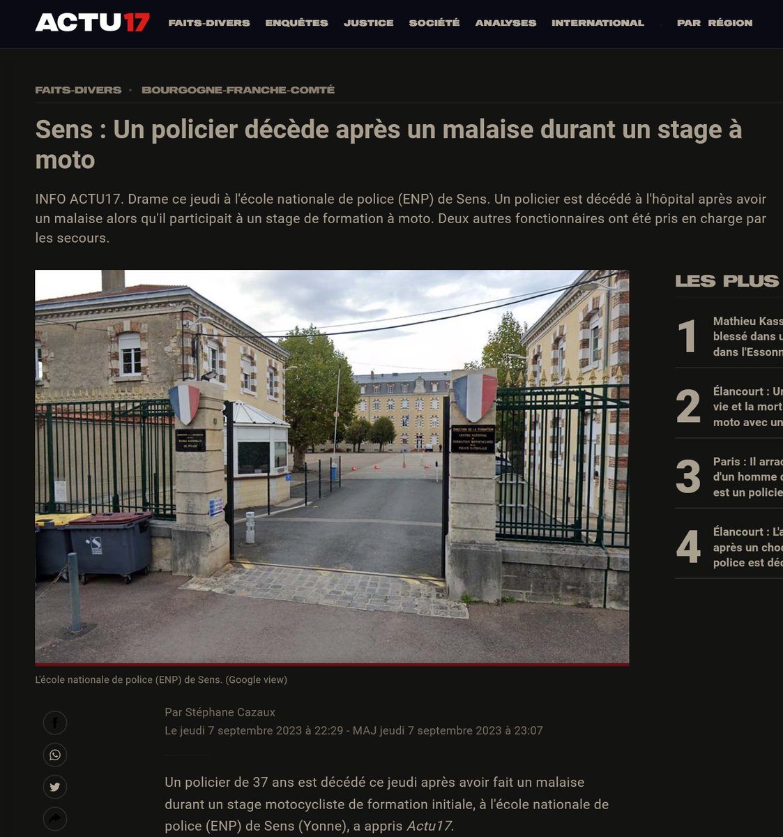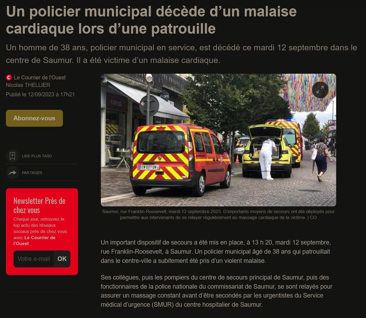 ça n'arrête pas... 12/9/23 Un policier municipal décède d’un malaise cardiaque lors d’une patrouille Un homme de 38ans, policier municipal en service, est décédé ce mardi 12 septembre dans le centre de Saumur. Il a été victime d’un malaise cardiaque. https://ouest-france.fr/societe/faits-divers/un-policier-municipal-decede-dun-malaise-cardiaque-lors-dune-patrouille-0ed9d65c-5167-11ee-bd2b-11d6ecd273da