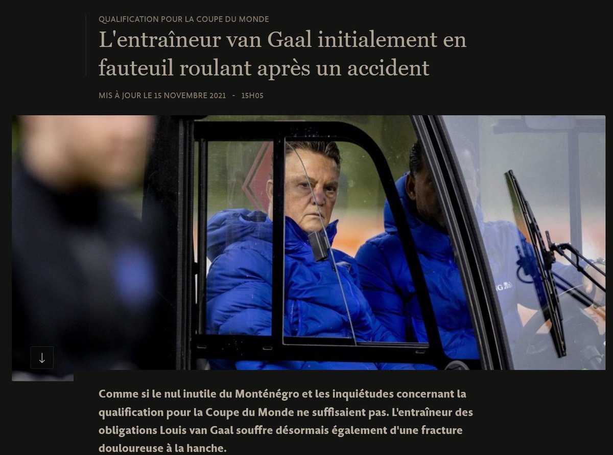 3/5) 15/11/21 Qualification pour la Coupe du monde : L'entraîneur van Gaal en fauteuil roulant après un accident de vélo https://www-faz-net.translate.goog/aktuell/sport/fussball/wm-quali-trainer-louis-van-gaal-nach-fahrradunfall-im-rollstuhl-17635438.html?_x_tr_sl=auto&_x_tr_tl=fr&_x_tr_hl=fr