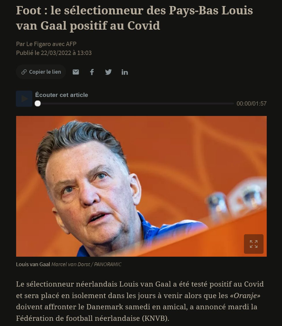 4/5) 22/3/22 Foot : le sélectionneur des Pays-Bas Louis van Gaal positif au Covid https://www.lefigaro.fr/sports/football/foot-le-selectionneur-des-pays-bas-louis-van-gaal-positif-au-covid-20220322