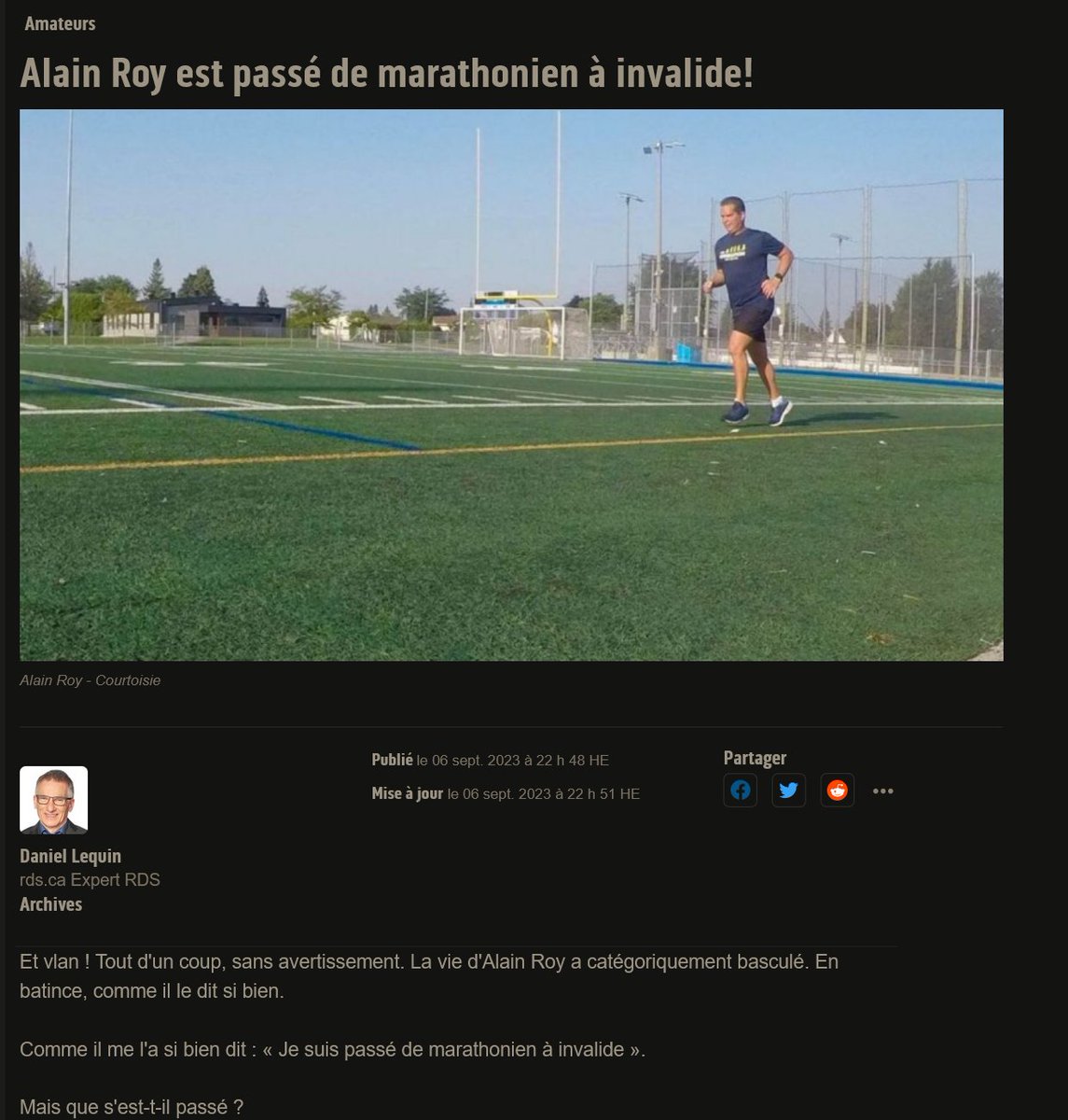 Quelqu'un pour lui expliquerla nouvelle normalité ??? 6/9/23 Alain Roy est passé de marathonien à invalide! Mais que s'est-t-il passé ? Il l'ignore pour le moment. "Printemps 2022, il commence à ressentir des douleurs à la cage thoracique" https://rds.ca/en-forme/alain-roy-est-passe-de-marathonien-a-invalide-1.17389251