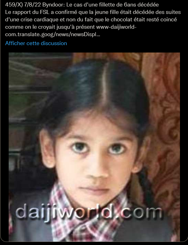 Thread 29 : Concernant des personnes qui seraient décédées en mangeant apriori en s'étouffant Photo 1fillette que l'ont croyait décédée en s’étouffant en mangeant, l'autopsie a révélée que c'était en faite un crise cardiaque, elle avait seulement 6anshttps://twitter.com/NaraShi13876794/status/1552048299947053058