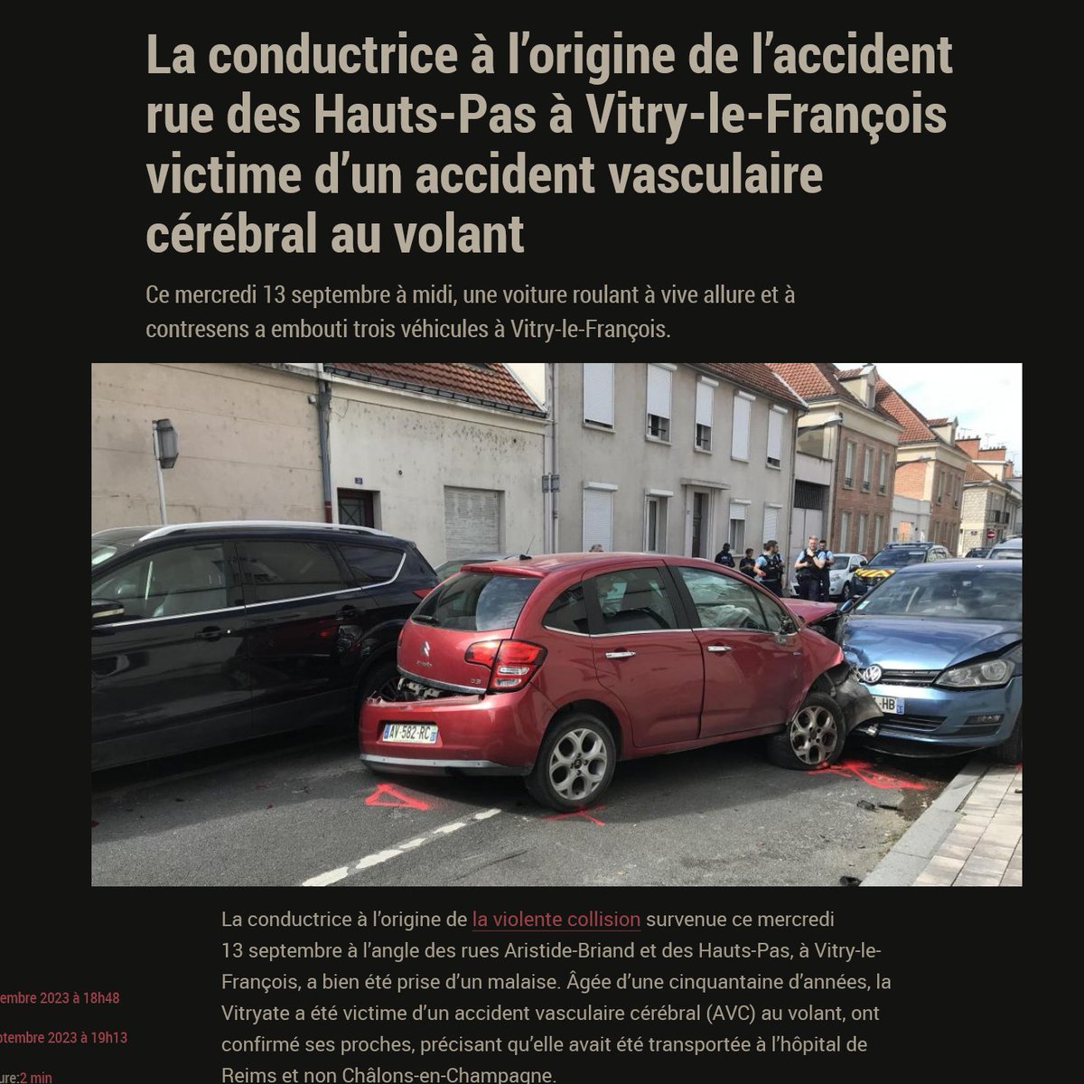Nouvelle normalité... 13/9/23 La conductrice à l’origine de l’accident rue des Hauts-Pas à Vitry-le-François victime d’un accident vasculaire cérébral au volant https://lunion.fr/id520176/article/2023-09-13/la-conductrice-lorigine-de-laccident-rue-des-hauts-pas-vitry-le-francois-victime