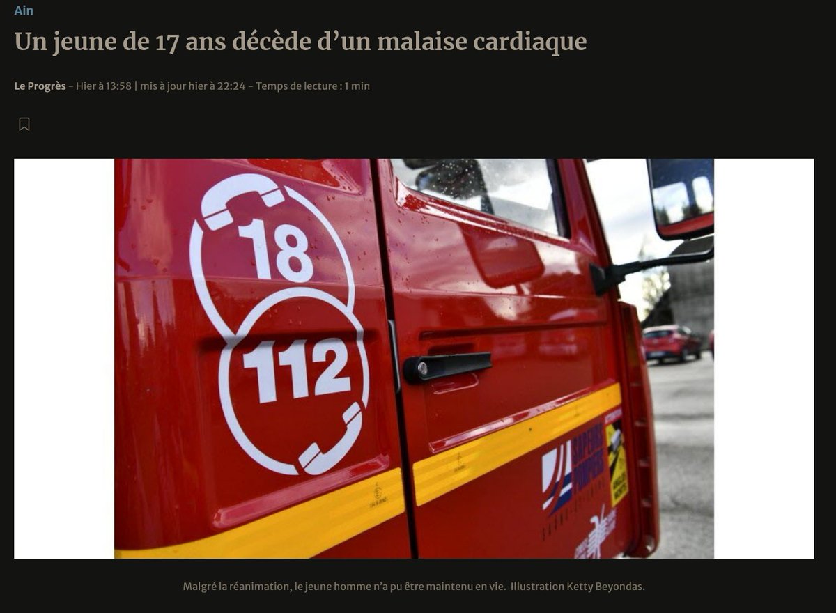 ↕️Trop Long Thread😔 1159/x) 20/12/23 Un jeune de 17ans décède d’un malaise cardiaque il a fait un malaise sur le parking d’une pizzeria où il était employé Malgré la réanimation cardiopulmonaire effectuée par les pompiers il n’a pu être maintenu en vie https://www.leprogres.fr/faits-divers-justice/2023/12/20/un-jeune-de-17-ans-decede-d-un-malaise-cardiaque