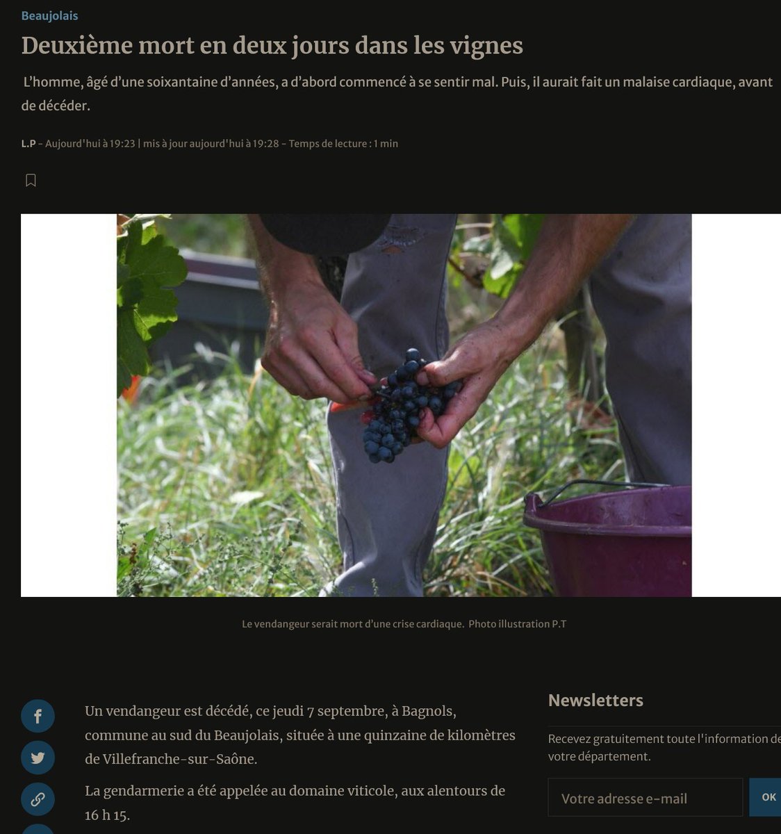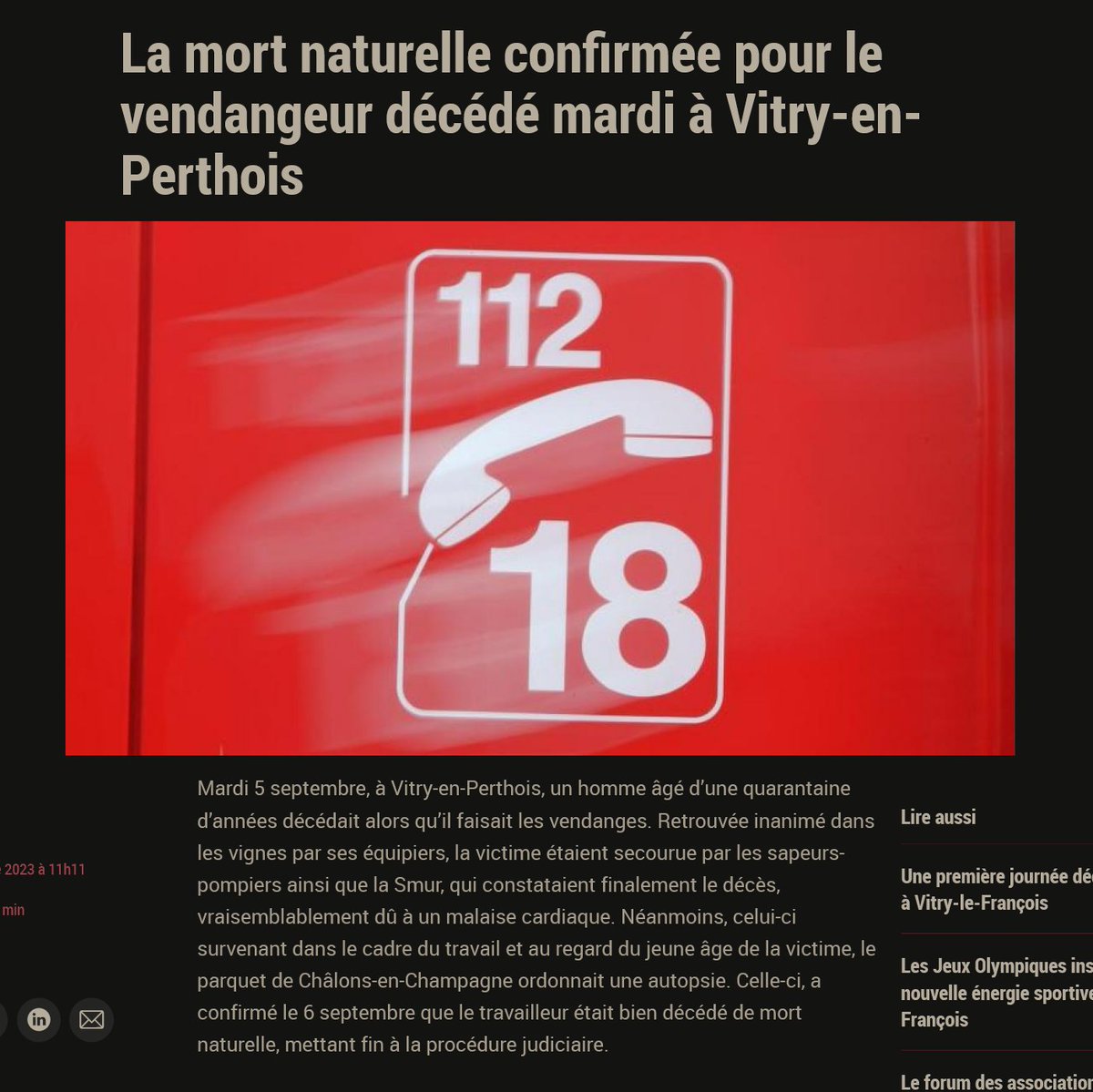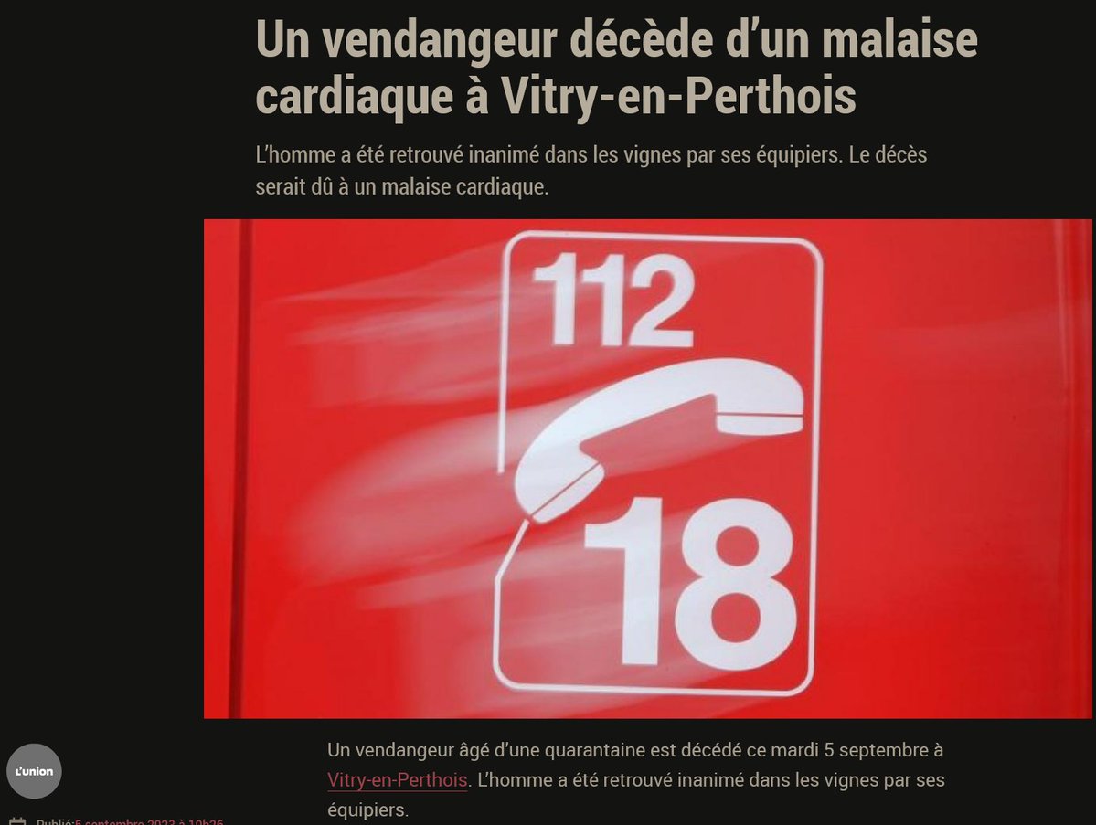 Mort naturelle à 40ans tout va bien, c'est la nouvelle normalité... 2 jours après un autre vendangeur décède pareil arrêt cardiaque... cherchez l'erreur 5/9/23 La mort naturelle confirmée pour le vendangeur décédé mardi à Vitry-en-Perthois https://lunion.fr/id518058/article/2023-09-07/la-mort-naturelle-confirmee-pour-le-vendangeur-decede-mardi-vitry-en-perthois
