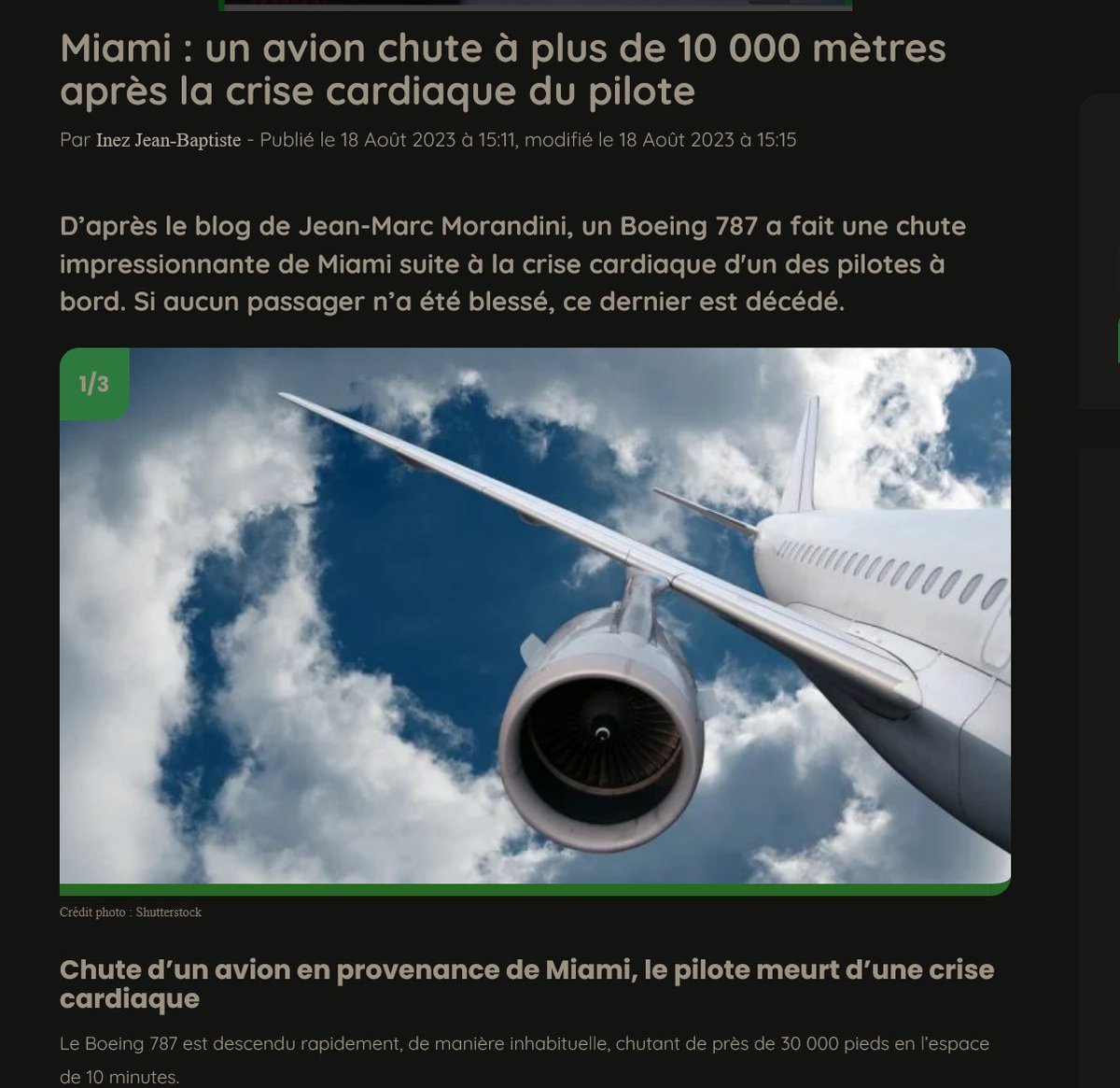 Juste la nouvelle normalité... Miami : un avion chute à plus de 10 000 mètres après la crise cardiaque du pilote Par Inez Jean-Baptiste - Publié le 18 Août 2023 https://melty.fr/societe/miami-un-avion-chute-a-plus-de-10-000-metres-apres-la-crise-cardiaque-du-pilote-1130546.html#item=1…