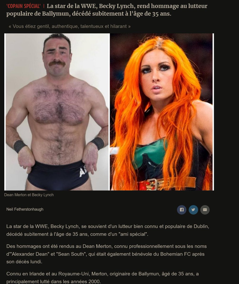 décédé subitement est devenu la nouvelle normalité... 6/9/23 La star de la WWE, Becky Lynch, rend hommage au lutteur populaire de Ballymun, décédé subitement à l'âge de 35ans. https://m.sundayworld.com/news/irish-news/wwe-star-becky-lynch-pays-tribute-to-popular-ballymun-wrestler-who-died-suddenly-aged-35/a1440122213.html