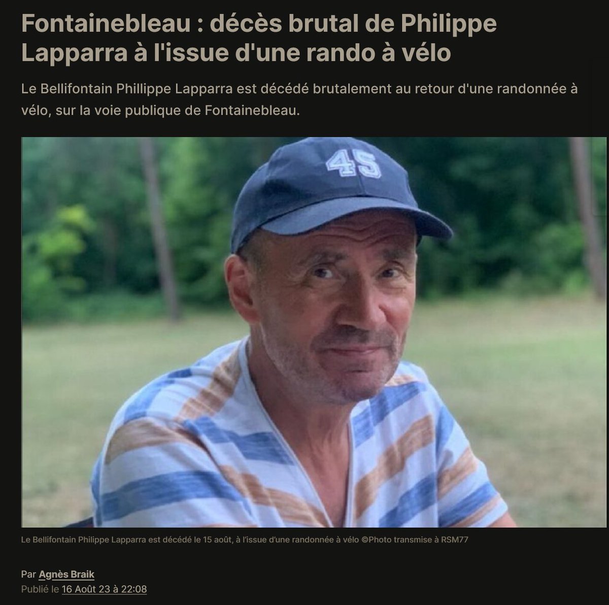 Nouvelle normalité.... 16/8/23 à l’issue d’un circuit à vélo d’une vingtaine de kilomètres 20km que Phillippe Lapparra, domicilié à Fontainebleau depuis une dizaine d’années, a fait un malaise cardiaque en arrivant dans la cité impériale https://actu.fr/ile-de-france/fontainebleau_77186/fontainebleau-deces-brutal-de-philippe-lapparra-a-lissue-dune-rando-a-velo_59973690.html