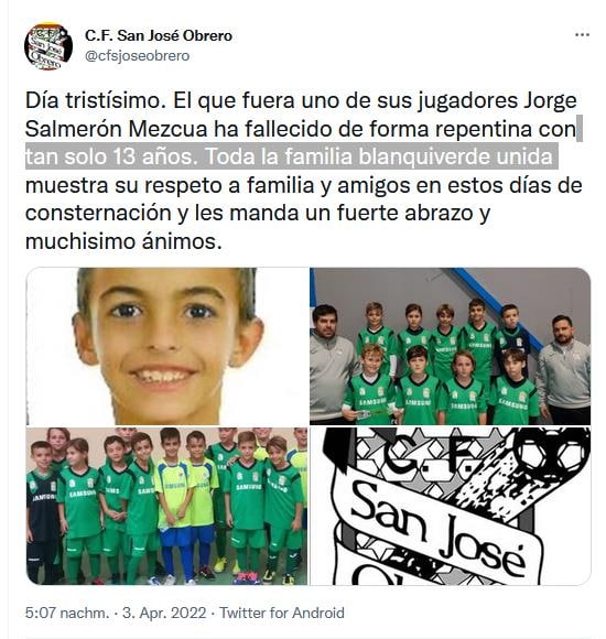 36/X) 03/04/22 Le football andalou est en deuil après avoir appris le décès de Jorge Salmerón Mezcua, joueur de l'UD San José Obrero de Jerez de la Frontera décédé subitement à l'âge de 13 ans https://www-portaldecadiz-com.translate.goog/mas-de-cadiz/deportes/69182-muere-a-los-13-anos-y-de-forma-repentina-un-jugador-de-futbol-gaditano?_x_tr_sl=auto&_x_tr_tl=fr&_x_tr_hl=fr