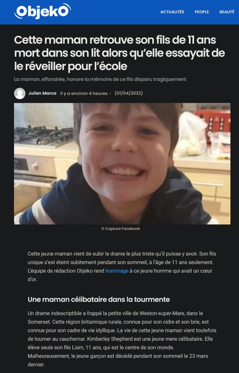 41/X) 23/03/22 Cette maman retrouve son fils de 11 ans mort dans son lit alors qu’elle essayait de le réveiller pour l’école Malheureusement, le jeune garçon est décédé pendant son sommeil le 23 mars dernier https://www.objeko.com/cette-maman-retrouve-son-fils-de-11-ans-mort-dans-son-lit-alors-quelle-essayait-de-le-reveiller-pour-lecole-1134270/