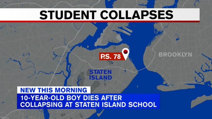 64/X) 23/03/22 NY STATEN ISLAND Un élève de 10ans a subi un épisode mortel lors d'un cours d'EPS, sans aucun signe évident de traumatisme. Une enquête préliminaire montre qu'il participait à une activité physique lorsqu'il s'est effondré. https://abc7ny-com.translate.goog/10-year-old-boy-collapse-dead-gym-class/11675880/?_x_tr_sl=auto&_x_tr_tl=fr&_x_tr_hl=fr