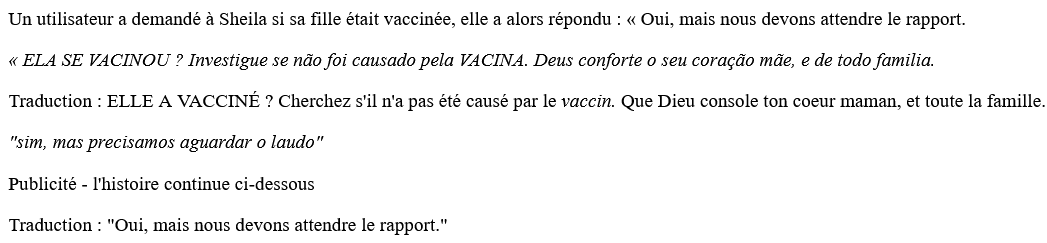 71/X) 16/03/22 Une fillette de 12 ans au Brésil serait décédée des suites d'une crise cardiaque pendant son sommeil "Un utilisateur a demandé à Sheila si sa fille était vaccinée, elle a alors répondu : « Oui, mais nous devons attendre le rapport." https://www-thegatewaypundit-com.translate.goog/2022/03/12-year-old-girl-brazil-died-reportedly-due-heart-attack-sleep/?_x_tr_sl=auto&_x_tr_tl=fr&_x_tr_hl=fr