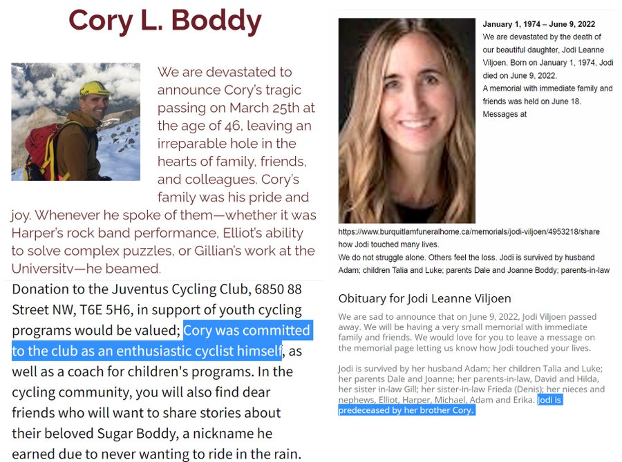FRÈRE ET SOEUR DÉCÉDÉS Edmonton, Alberta - Cory Boddy 46ans est décédé subitement le 25 mars 2022 Sa sœur Jodi Leanne Viljoen 48ans est décédée subitement le 9 juin 2022 La mort de plusieurs membres d’une famille vaccinés contre le C19 devient de plus en plus courante maintenant