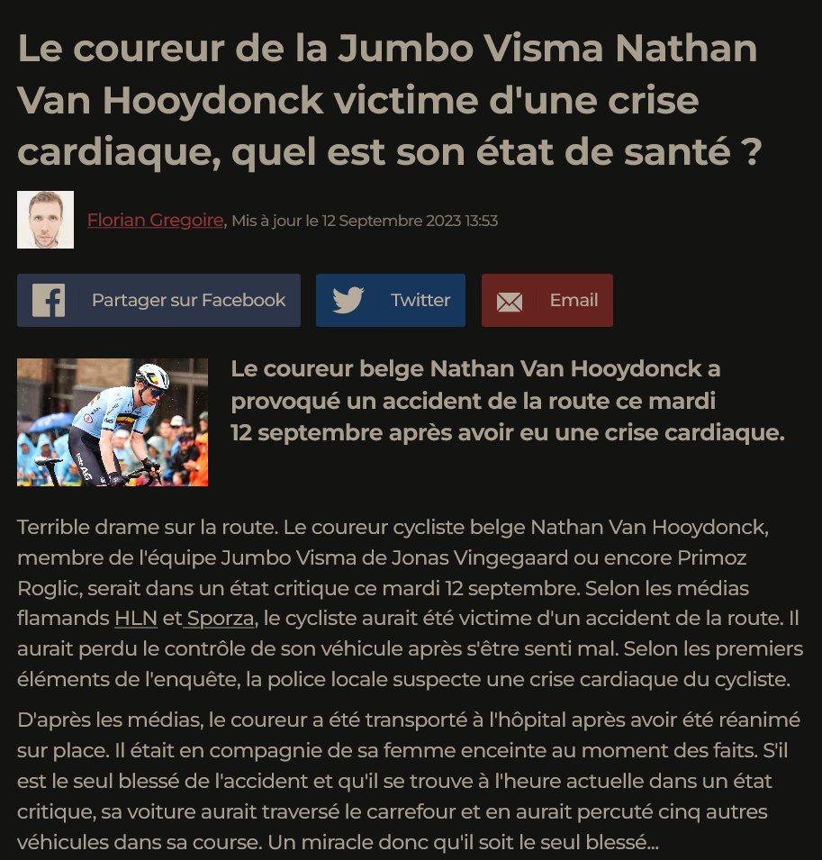 Nouvelle normalité !!! 12/9/23 Le coureur belge Nathan Van Hooydonck 27ans a provoqué un accident de la route ce mardi après avoir eu une crise cardiaque. D'après les médias, le coureur a été transporté à l'hôpital après avoir été réanimé sur place https://www.linternaute.com/sport/cyclisme/3533769-le-coureur-de-la-jumbo-nathan-van-hooydonck-victime-d-une-crise-cardiaque-et-dans-un-etat-critique/