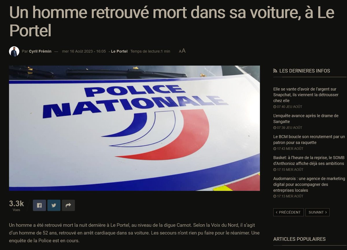 Nouvelle normalité 16/8/23 Un homme a été retrouvé mort la nuit dernière à Le Portel, il s’agit d’un homme de 52 ans, retrouvé en arrêt cardiaque dans sa voiture. Les secours n’ont rien pu faire pour le réanimer. Une enquête de la Police est en cours. https://deltafm.fr/info-locale/region/pas-de-calais/boulonnais/le-portel/un-homme-retrouve-mort-dans-sa-voiture-a-le-portel/
