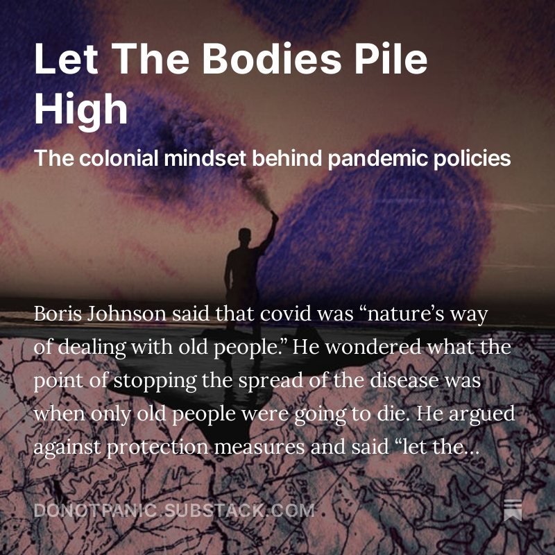 Boris Johnson argued for the free spread of covid in the UK, telling officials 'let the bodies pile high.' This reflects a colonial mindset about viruses that has been responsible for tens of millions of deaths over centuries🧵