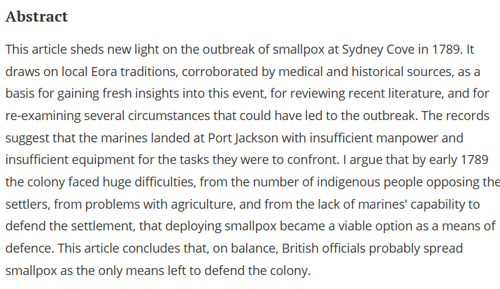 Many Aboriginal people suspect smallpox was deliberately introduced to kill them. Historians believe it too, citing the handful of years between the outbreaks in North America and the outbreak in Australia, as well as the losing position the colonists found themselves in in 1789