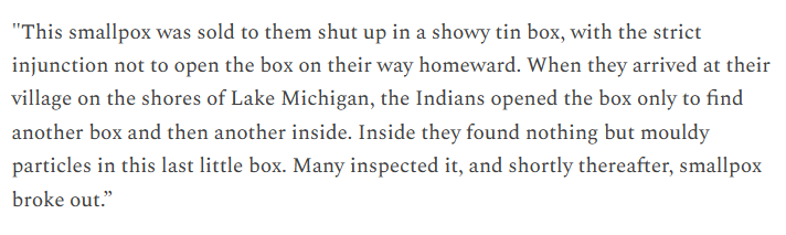 In 1763, British colonists were losing to the Shawnee and Mingo warriors in Ohio. A British commander wondered: “Could it not be contrived to send the small pox among those disaffected tribes of Indians? We must, on this occasion, use every stratagem in our power to reduce them.”