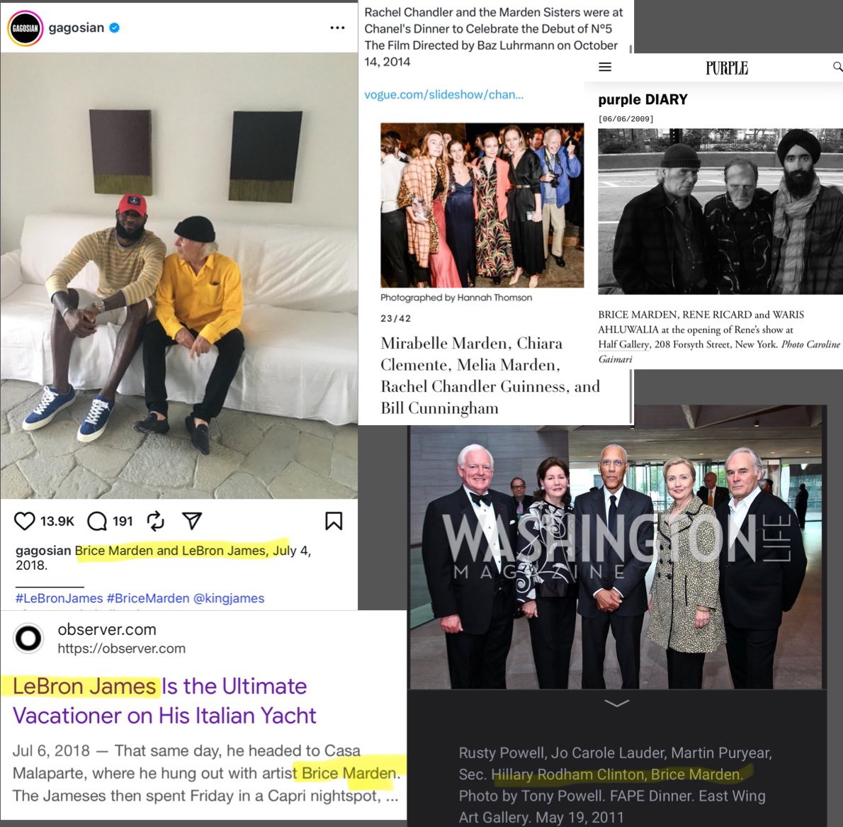 In 2018, LeBron James vacationed in the Isle of Capri where he met painter Brice Marden. Brice Marden is connected to Hillary Clinton through the Foundation for Art and Preservation in Embassies (FAPE) and runs in the same circles as Rachel Chandler. Brice’s daughters Mirabelle and Melia Marden have both been seen with Rachel Chandler on numerous occasions. Mirabelle Marden has even been spotted with BOTH Rachel Chandler and Ghislaine Maxwell before - see receipts on the thread below. Ed Tuttle (who designed the main residence home for Jeffrey Epstein on Little St. James) even built homes for the Mardens. Brice’s second daughter Melia Marden married Frank Sisti, who ran Kid Club America which anons/independent researchers exposed back in January 2024. It’s a big club that LeBron happens to be in “After signing with the Lakers, LeBron took "summer vacation" to another level - he and his family jetted to Italy, where they chilled out aboard a luxury yacht on the Amalfi Coast. On July 4, 2018 he was seen hanging out with acclaimed artist Brice Marden at the Modern masterpiece, Casa Malaparte on the Isle of Capri. From jazz at LACMA to the family-friendly Summer Nights at Descanso Gardens, the James family will love attending the numerous cultural nights out in LA.” Source of above quotation: https://www.discoverlosangeles.com/things-to-do/the-guide-to-lebron-james-los-angeles#:~:text=LeBron%20James%20and%20Brice%20Marden,cultural%20nights%20out%20in%20LA.
