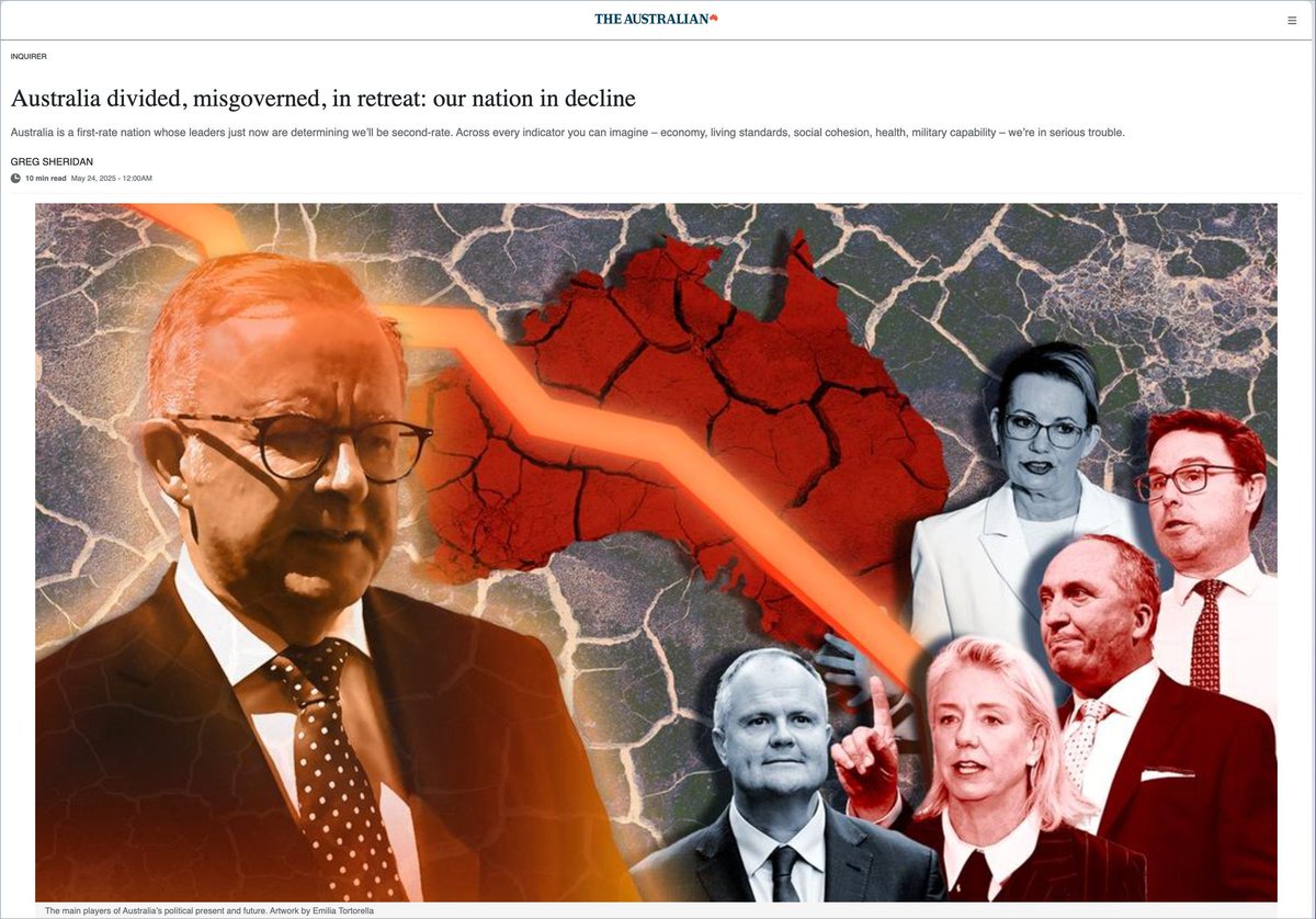 Greg Sheridan’s brutal truth: “Australia is a first-rate nation whose leaders just now are determining we’ll be second-rate.” Collapse isn’t looming. It’s here. And they’re driving it. 3/14