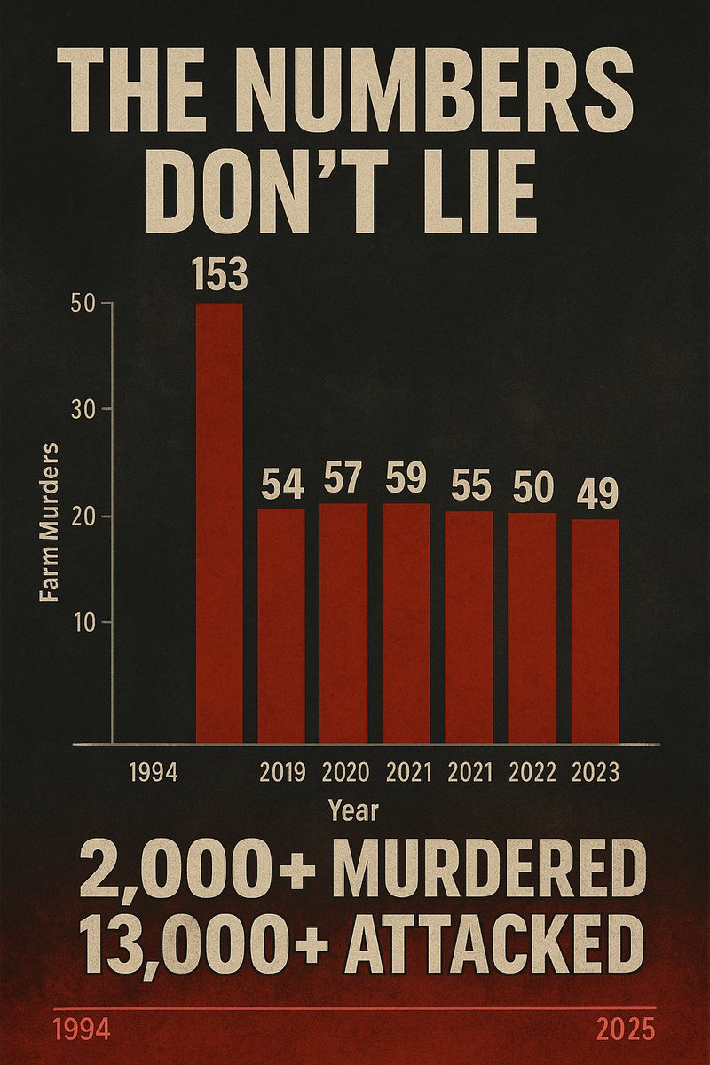 Since 1994: •13,000+ farm attacks •2,000+ murdered •In 1998: 153 farmers killed •Today: 1 farmer murdered per week The murder rate? 4x the national average. (4/25)
