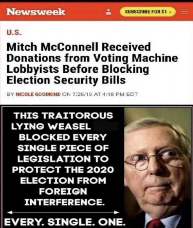 Mitch McConnell received donations from magic electronic voting machine lobbyist before blocking election security bill in 2019. Should Mitch be the next Mc to go? Yes or No https://t.co/IvxESUmSmr