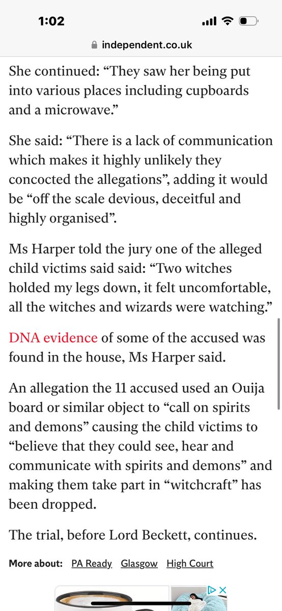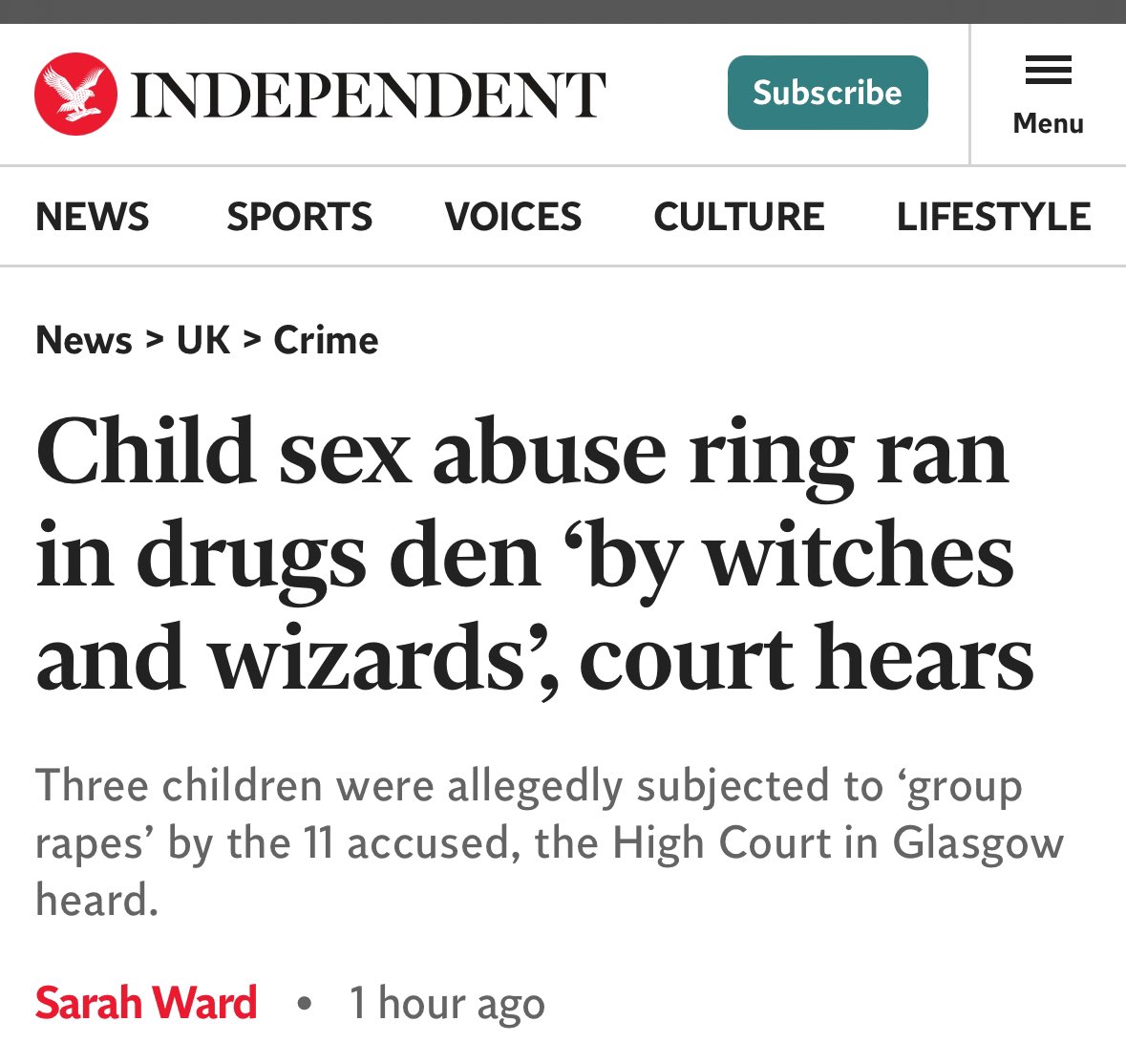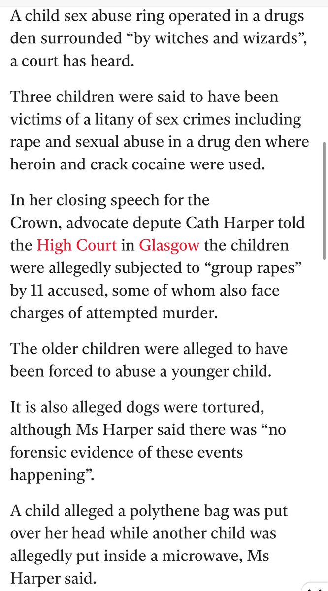 💥🚨💥🚨💥🚨💥🚨💥🚨 I thought this was just a “conspiracy theory”? Child sex abuse ring ran in drugs den ‘by witches and wizards’, court hears Three children were allegedly subjected to ‘group rapes’ by the 11 accused, the High Court in Glasgow heard. https://www.independent.co.uk/news/uk/crime/glasgow-high-court-dna-evidence-b2439167.html