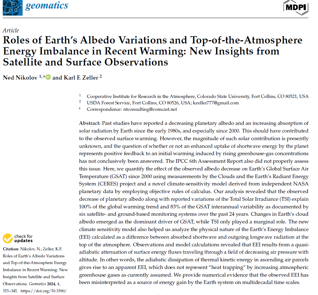 🚨BREAKING: Our long-awaited 30-page climate paper was published today: -MDPI Geomatics website: https://mdpi.com/2673-7418/4/3/17 -PDF: https://mdpi.com/2673-7418/4/3/17/pdf This is a seminal study, which demonstrates through observations and math that the Sun (not CO2) drives Earth's climate!