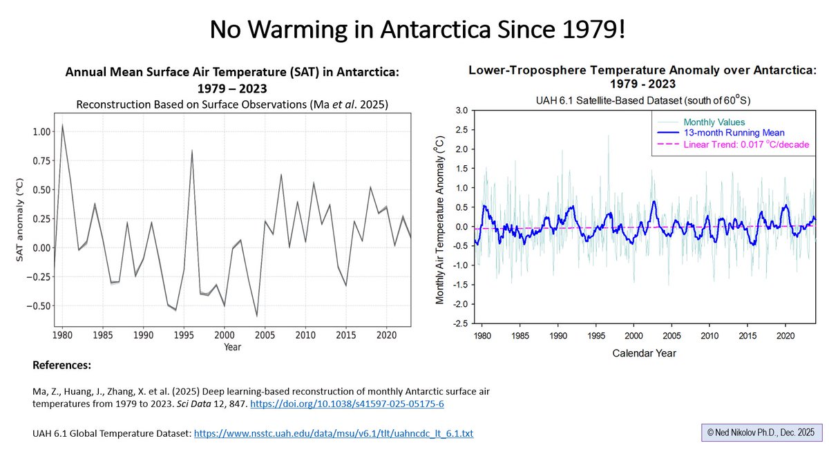 🚨Data are now conclusive: There has been NO warming in Antarctica since 1979! This is shown by both surface- and satellite-based observations: - Surface data: Ma et al. (2025: https://www.nature.com/articles/s41597-025-05175-6) - Satellite Data: UAH 6.1 (2025: https://www.nsstc.uah.edu/data/msu/v6.1/tlt/uahncdc_lt_6.1.txt)