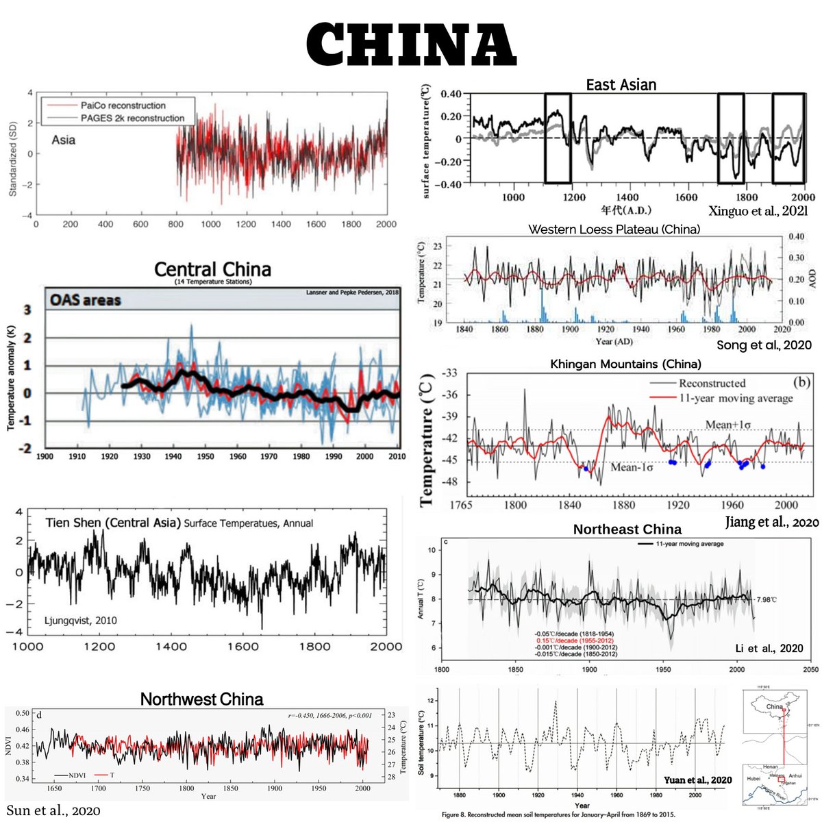 @NiusMarco Chine / Asie : Toutes les reconstructions de température ou mesures thermométriques non biaisées montrent aucun réchauffement net ou une légère baisse ou période médiévale plus chaude qu’aujourd’hui. Voici quelques exemples.