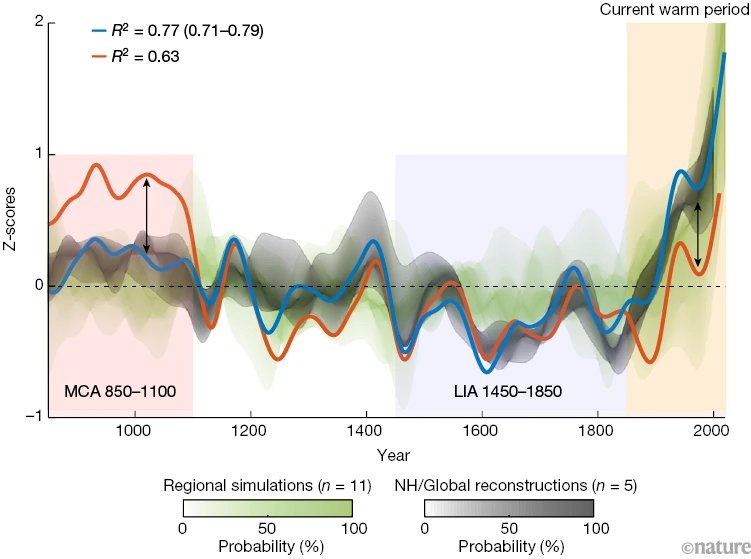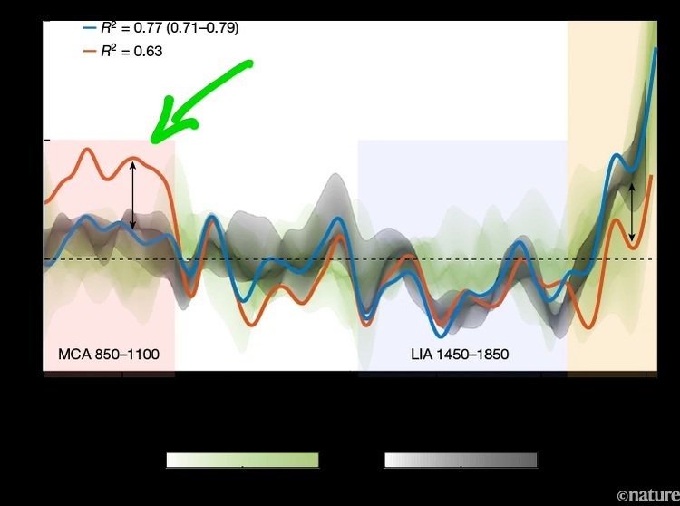 @Elpis_R @NiusMarco L'argument de la période chaude médiévale. C'est un vieux classique. Bien que certaines régions aient connu des conditions plus chaudes pendant cette période, ce n'était pas un phénomène mondial. Et on est loin au dessus : https://www.nature.com/articles/s41586-023-06176-4