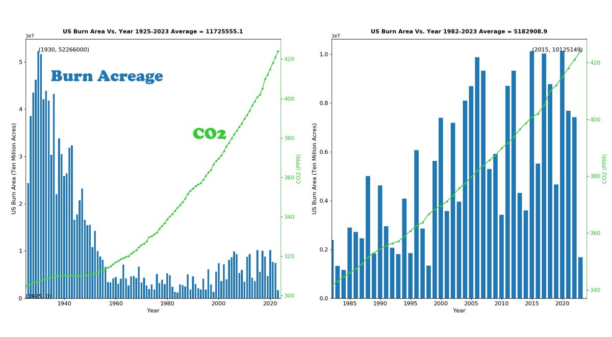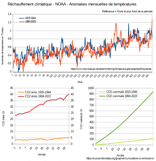 Le réchauffement entre 1915 et 1944 est exactement le même que celui de 1994-2023 . Avec 8 fois plus d'émissions (annuelles ou cumulées). Pourtant le GIEC affirme que leur contribution au réchauffement depuis 1850 est de 100% . C'est juste impossible https://t.co/SrXT3ClHbo