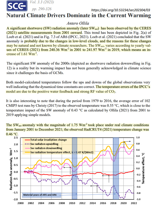 Nouvelle étude : Selon les observations du CERES, l'anomalie de rayonnement à ondes courtes (SW) a augmenté de +1,75 W/m² de 2001 à 2021, ce qui est probablement dû aux variations naturelles de la couverture nuageuse. Ce forçage SW peut expliquer le réchauffement (0,46°c)