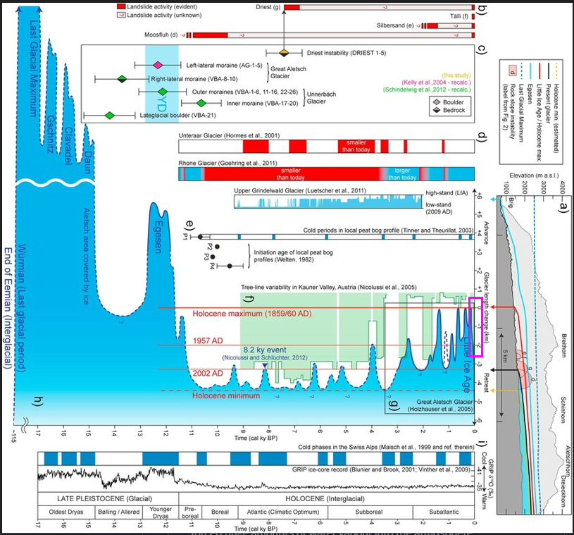 Longueur du glacier D'Aletsch (suisse) depuis 17000 ans. Plus la zone bleue est haute plus le glacier est long . Je vous ai mis dans un rectangle rose la situation depuis 1856 (fin du petit âge glaciaire) qui représente l'énorme réchauffement actuel. 😏https://researchgate.net/publication/315058226_Beyond_debuttressing_Mechanics_of_paraglacial_rock_slope_damage_during_repeat_glacial_cycles_PARAGLACIAL_ROCK_SLOPE_MECHANICS